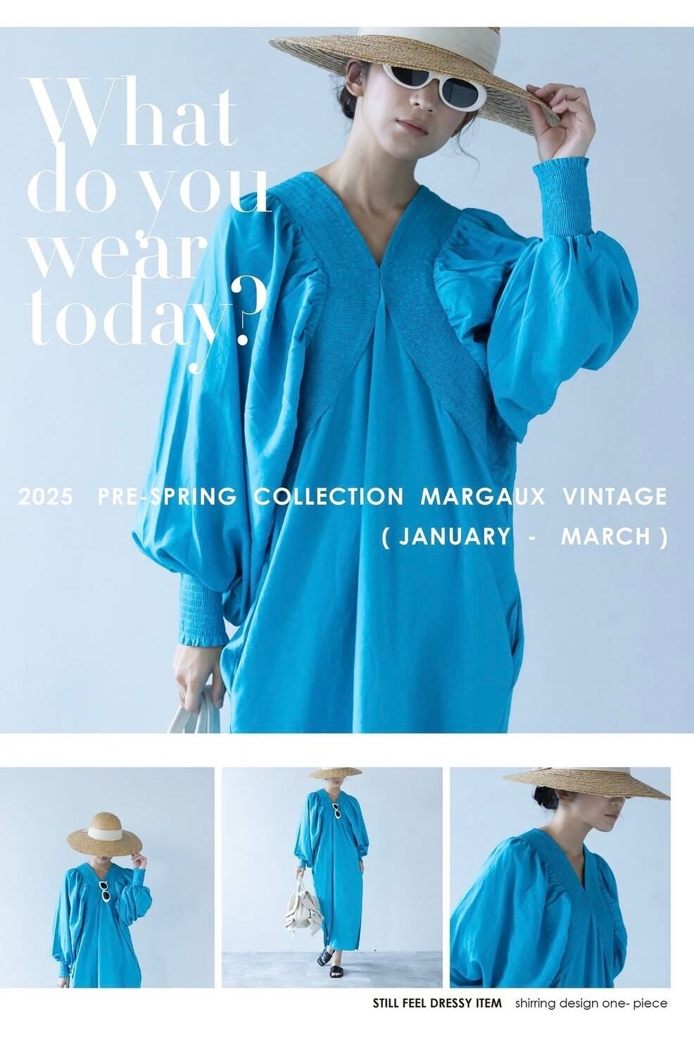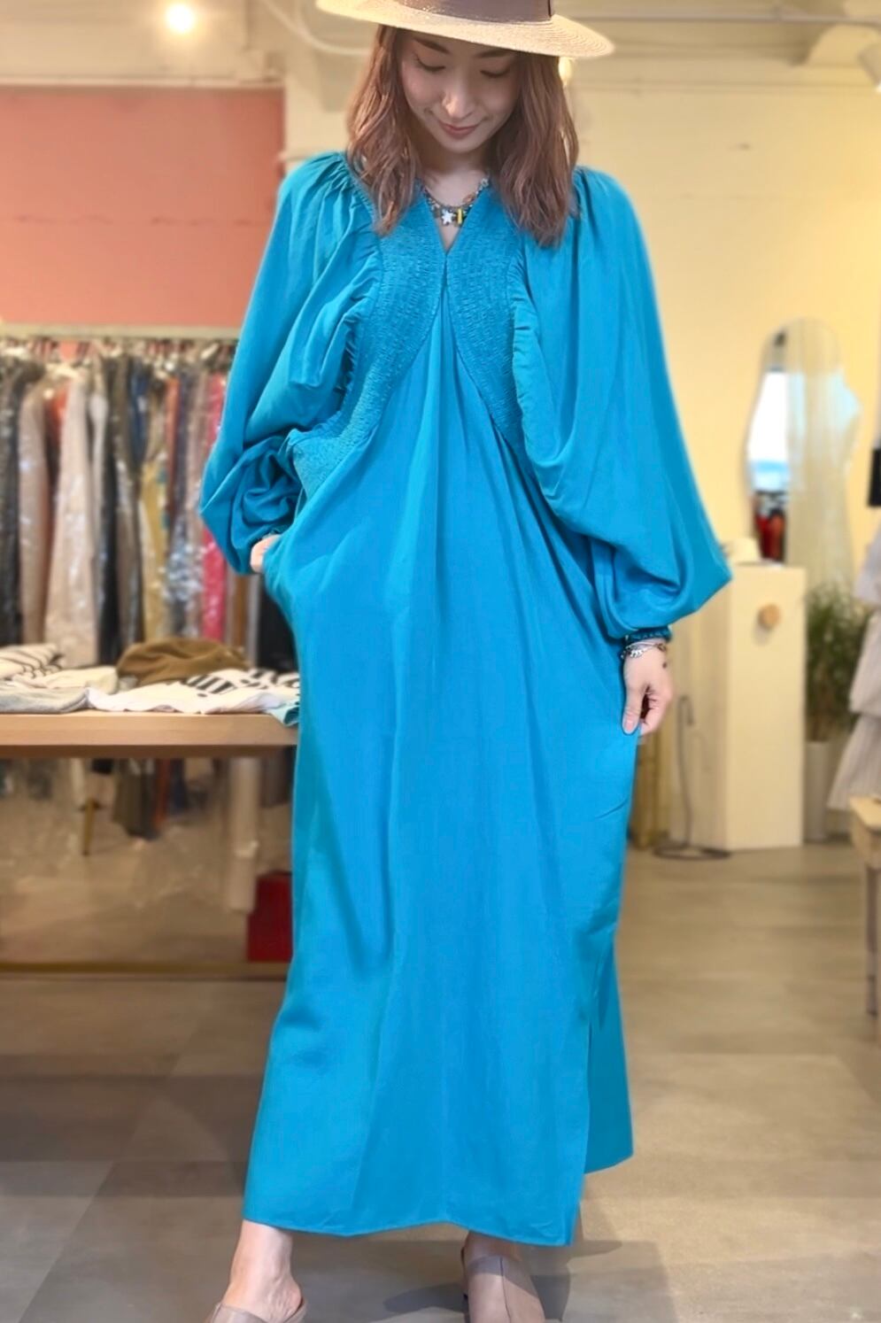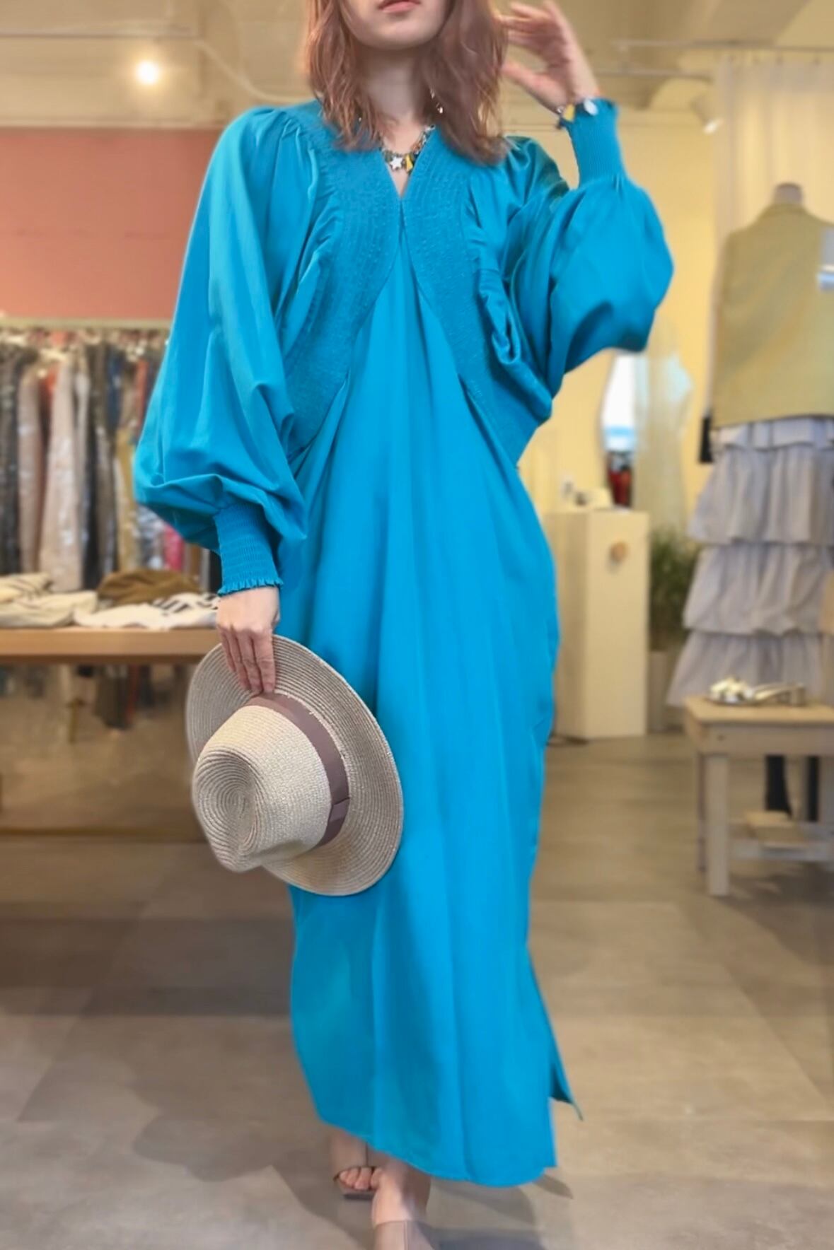 バスト〜脇にかけて、幅太のギャザーをあしらった、ボリューム袖のコクーン型ワンピース。