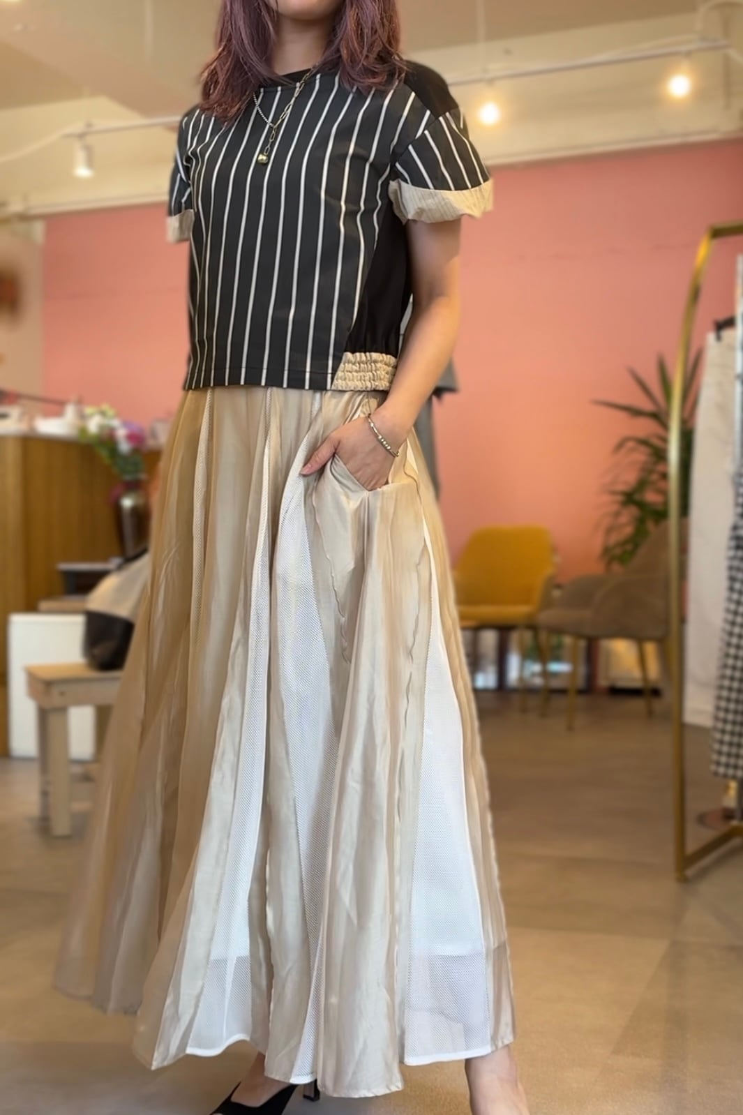 2種類のストライプ柄部分はブラウス生地、背面の無地部分はTシャツ生地となっており、着心地はさらっと楽チン◎