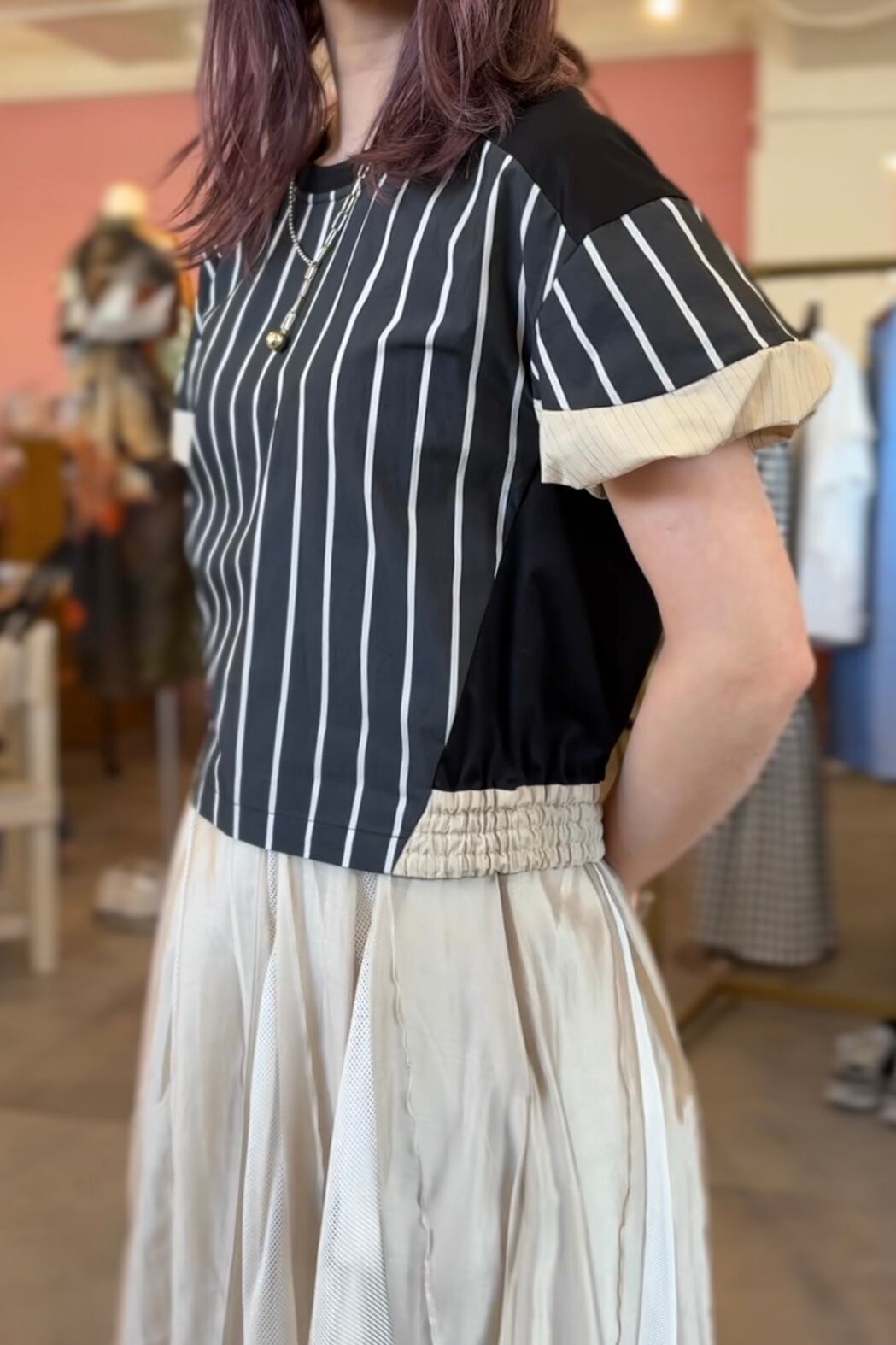 インスタ動画でご好評いただいている、ストライプ切替の短めトップス!