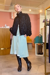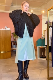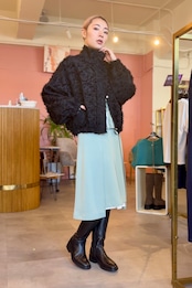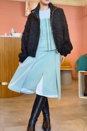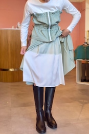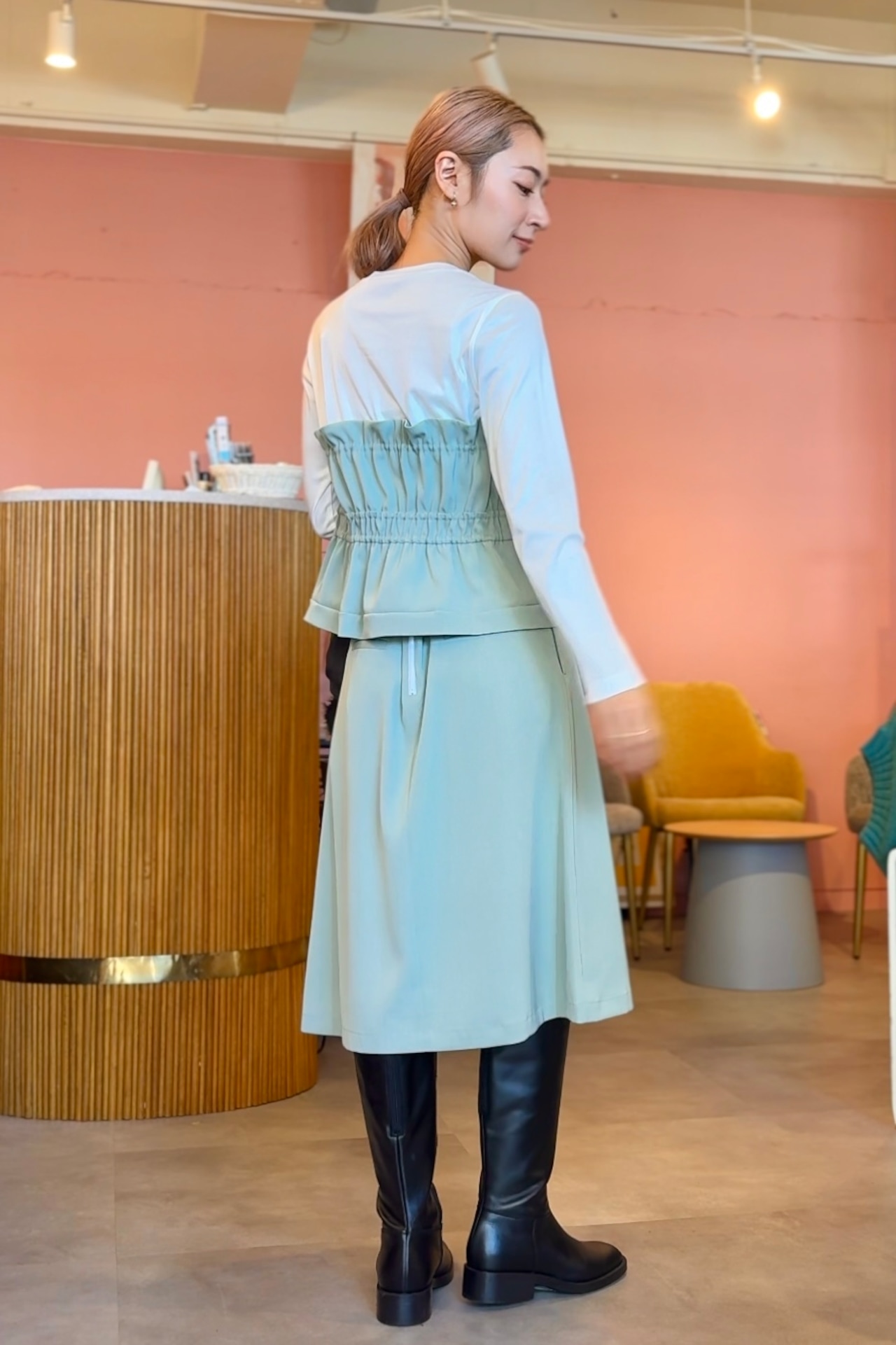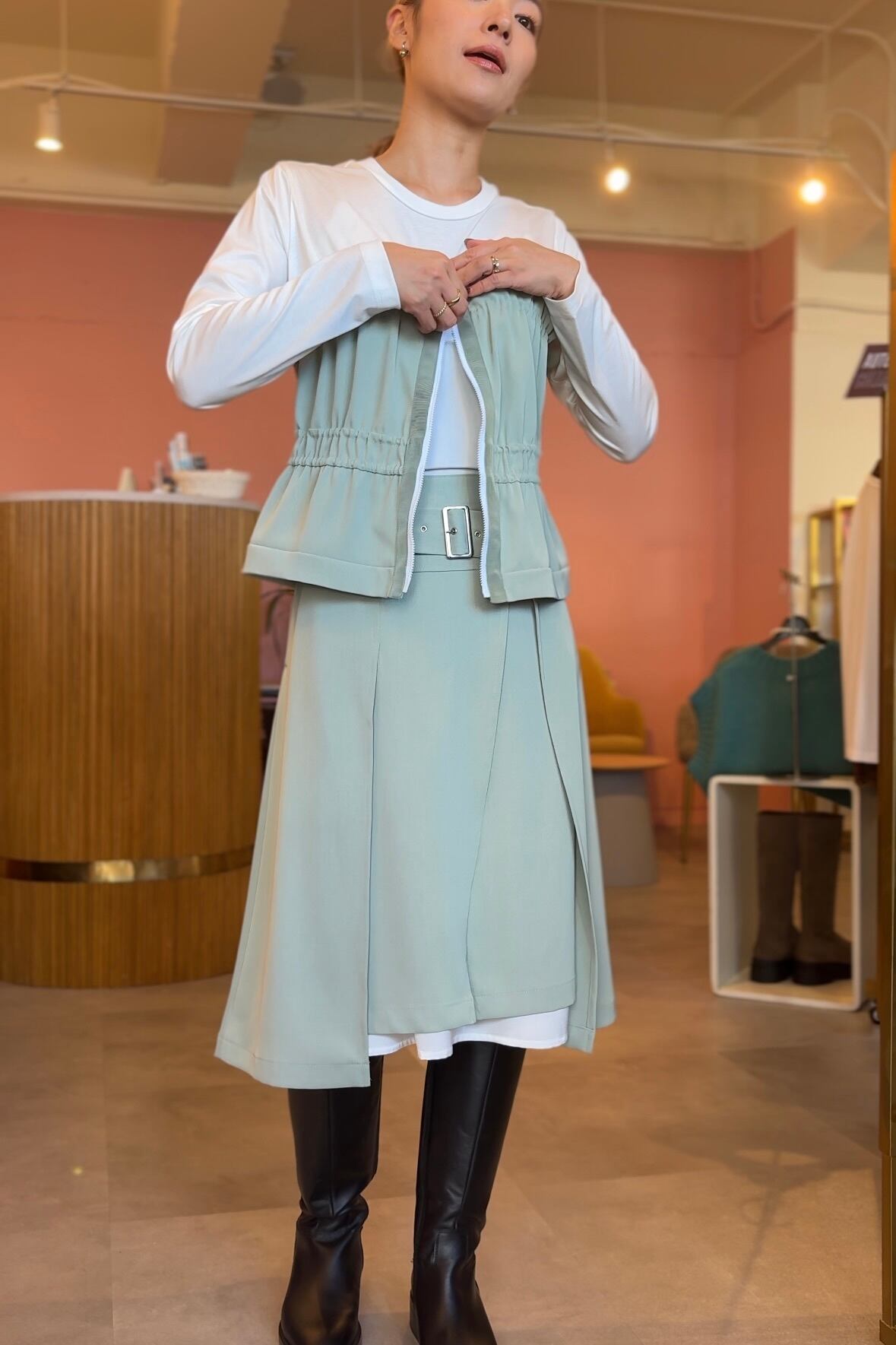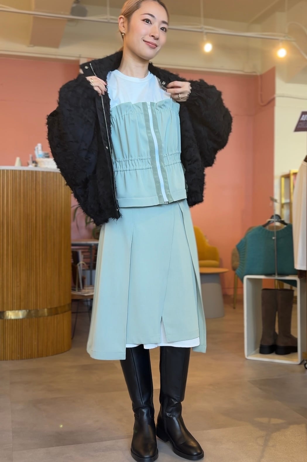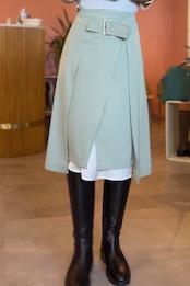 シャリ感のある素材の、フロントラップ風デザインのスカート。