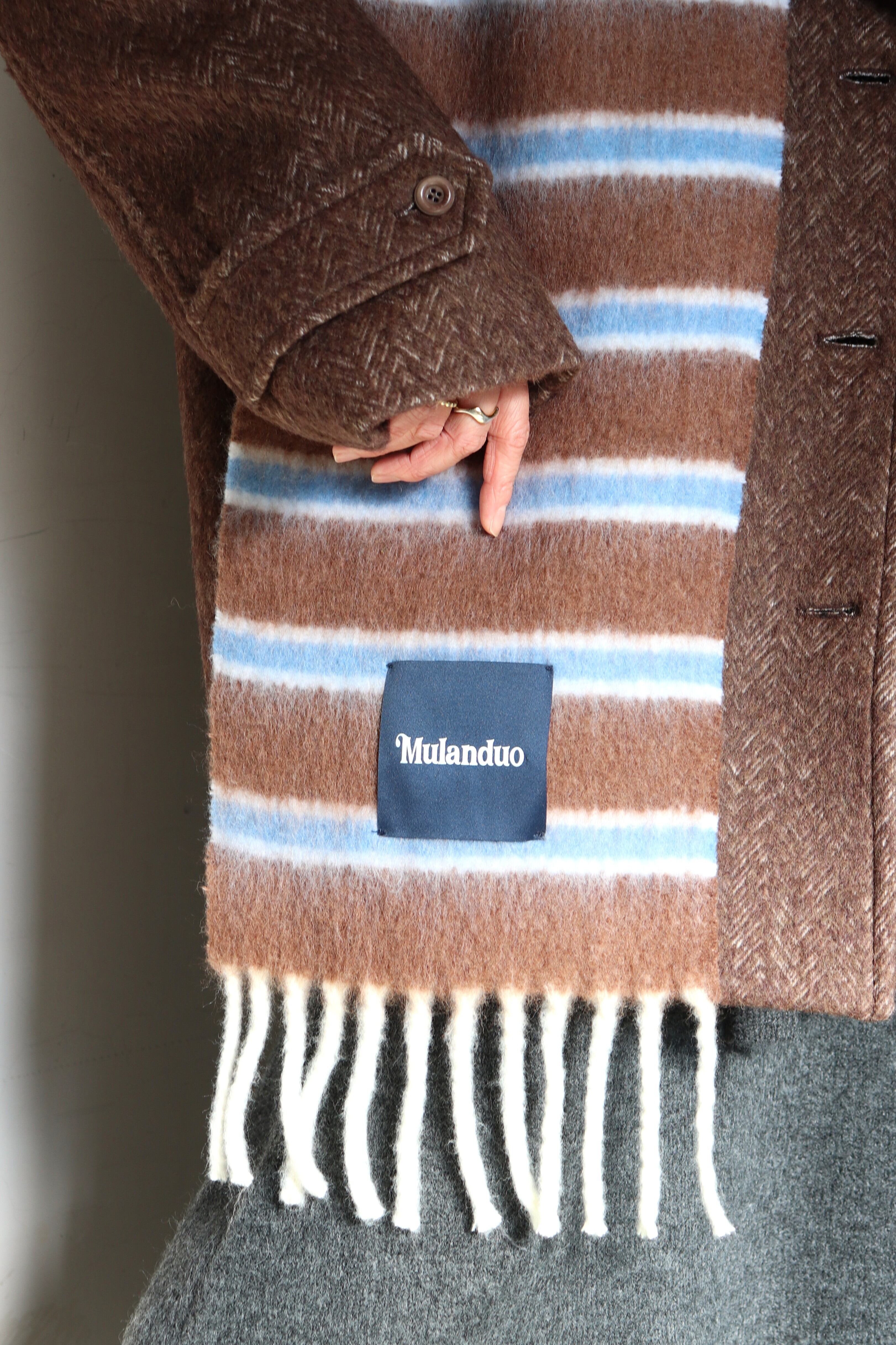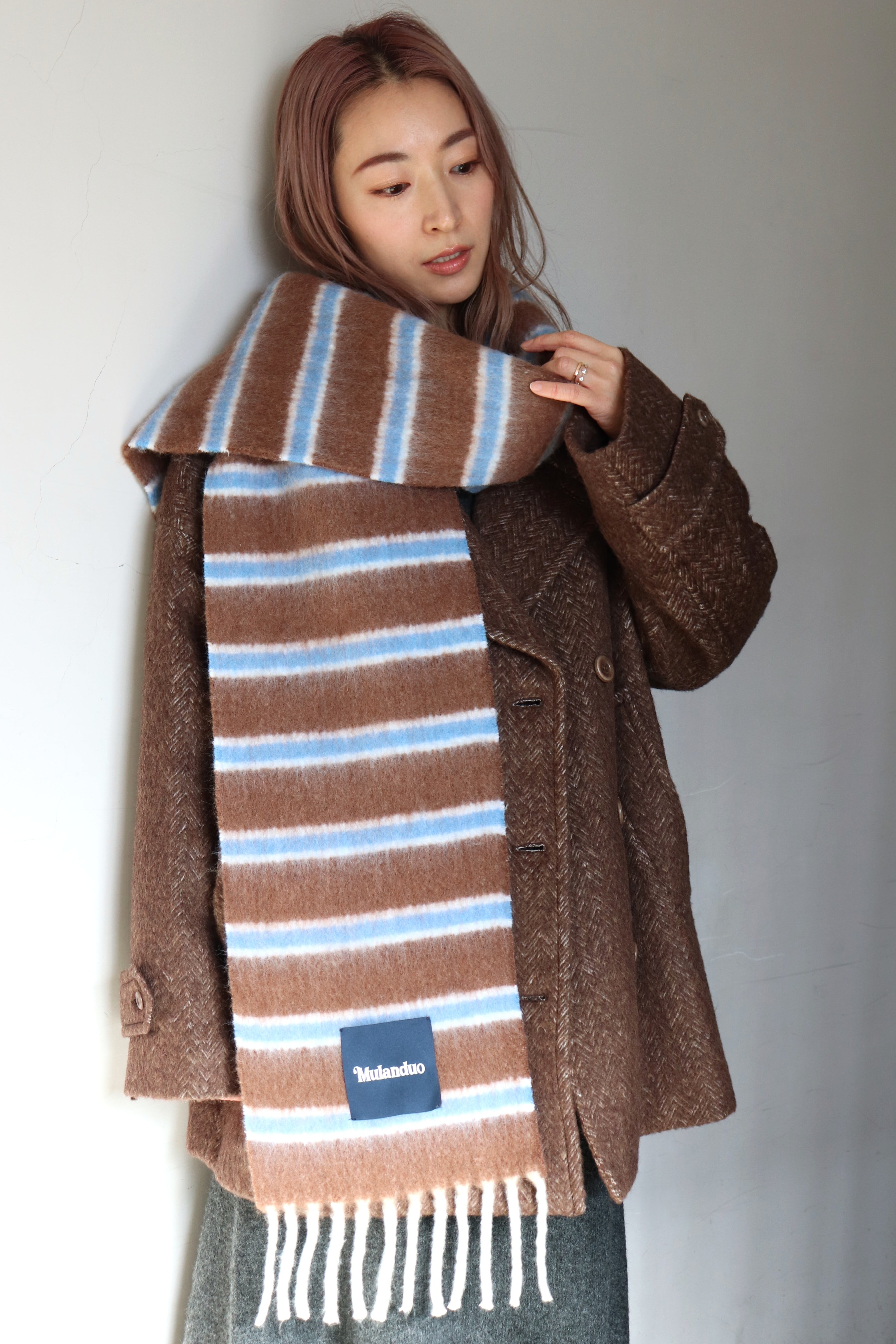 ブラウンとライトブルーの色合いが大人可愛いマフラー。