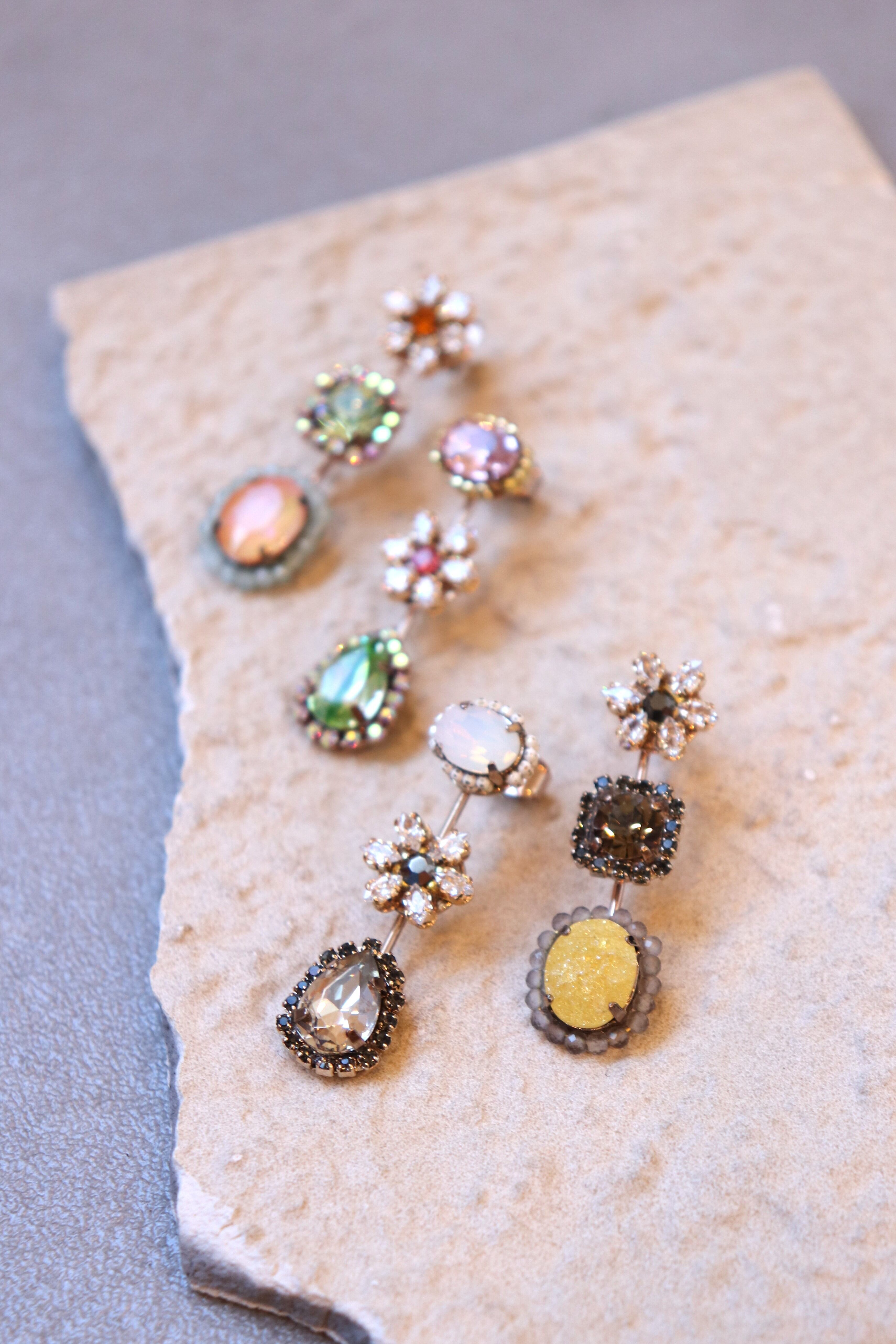 花のモチーフとビジューが煌めくアシメデザインピアス。