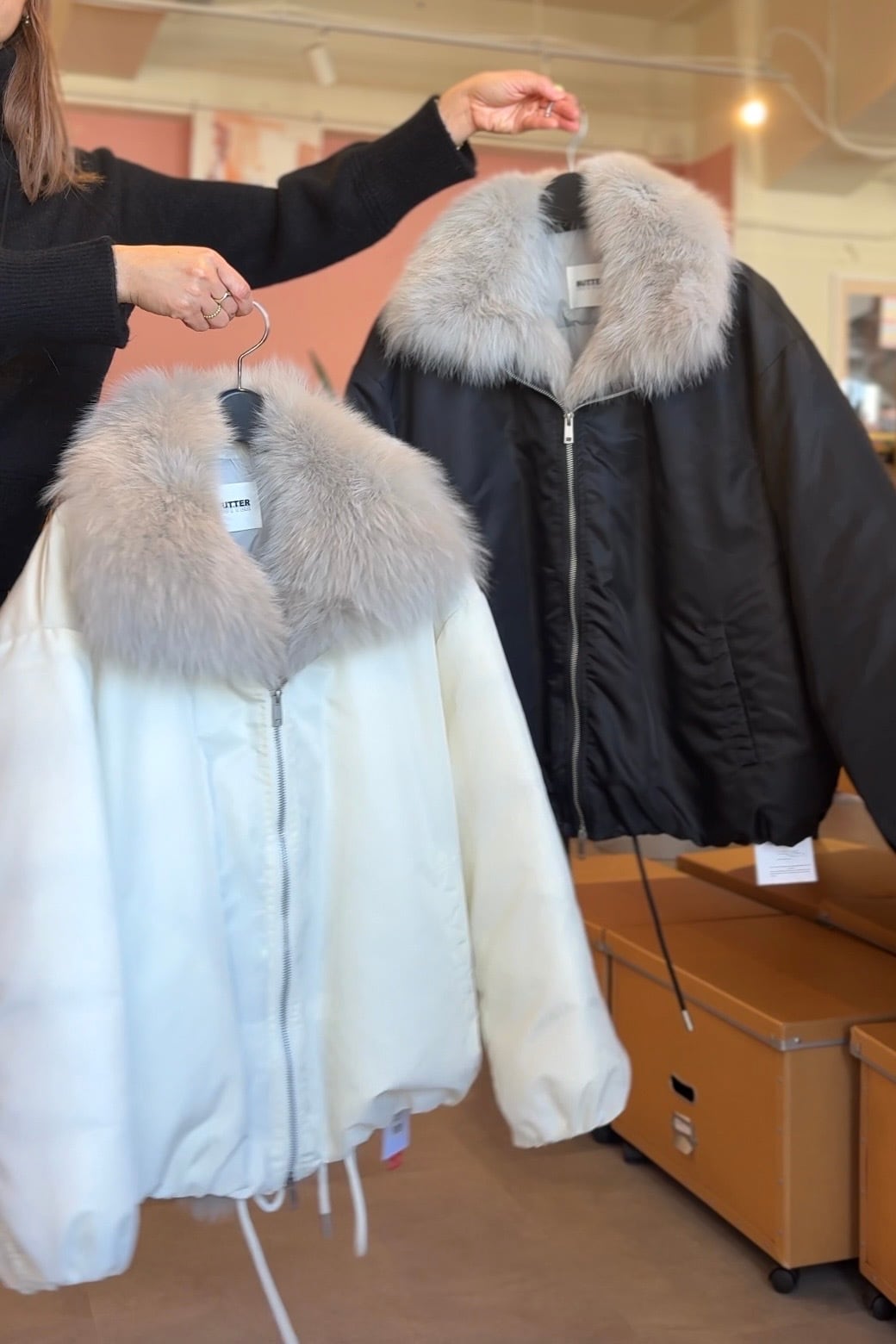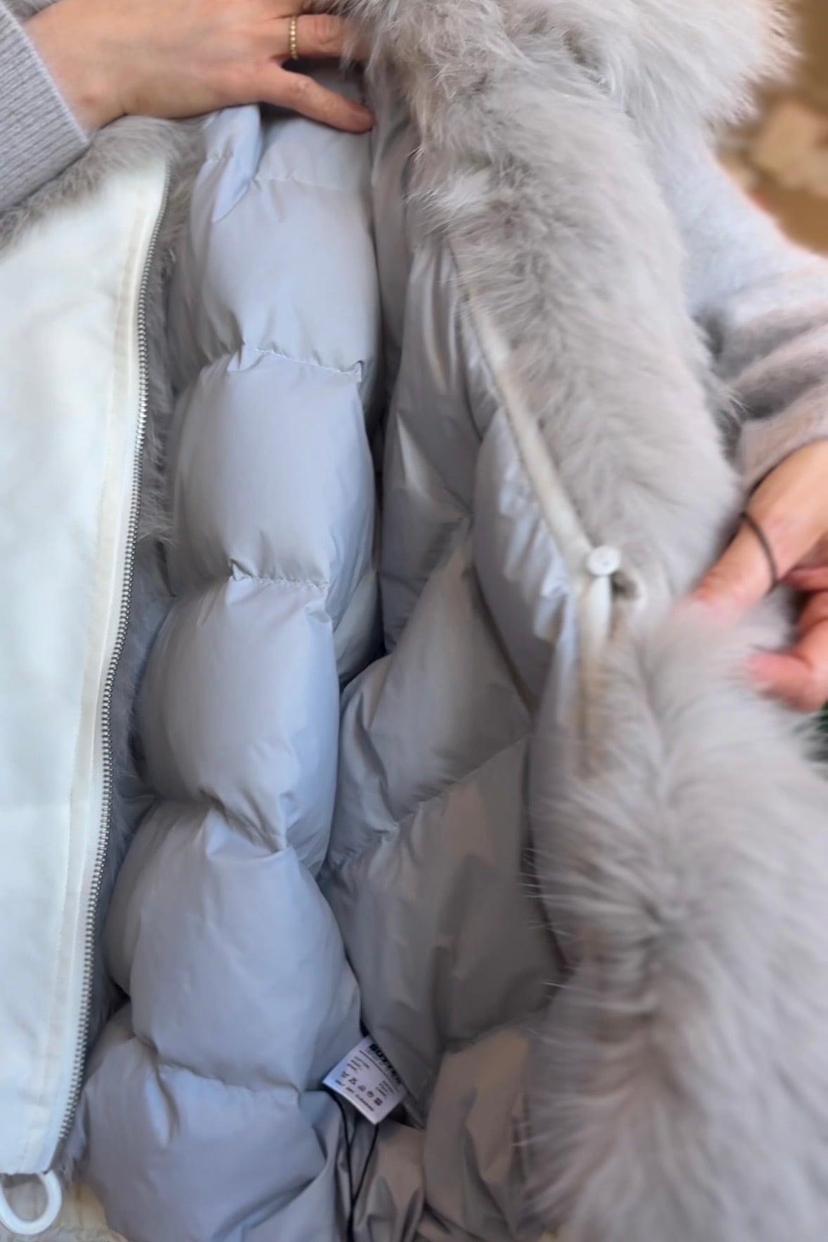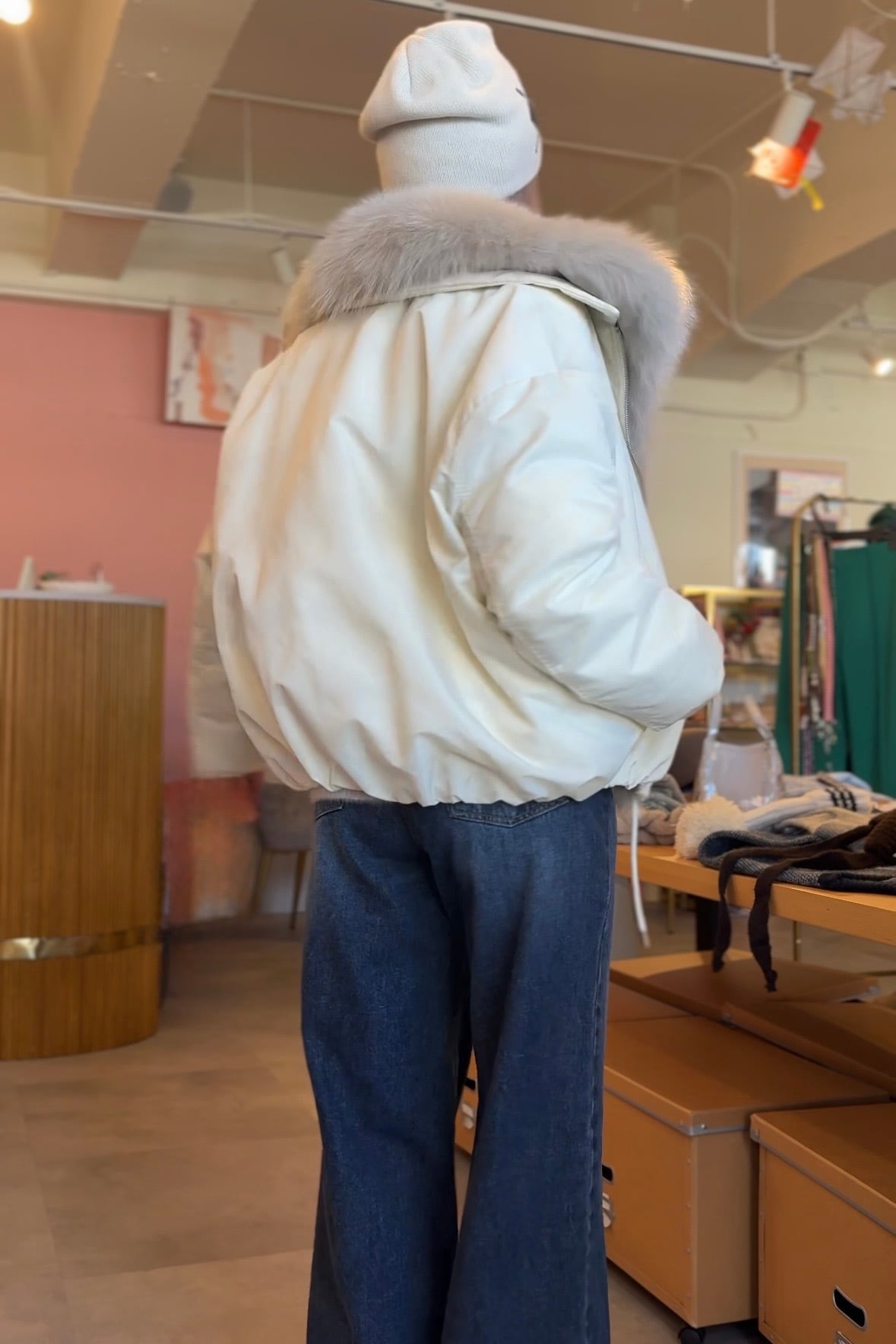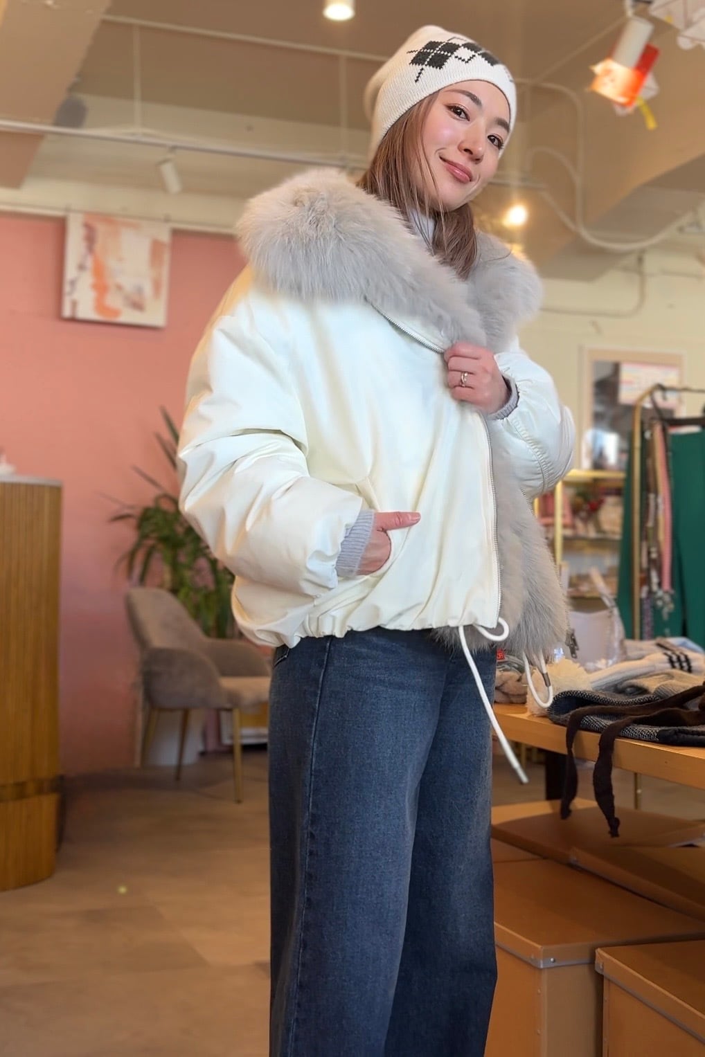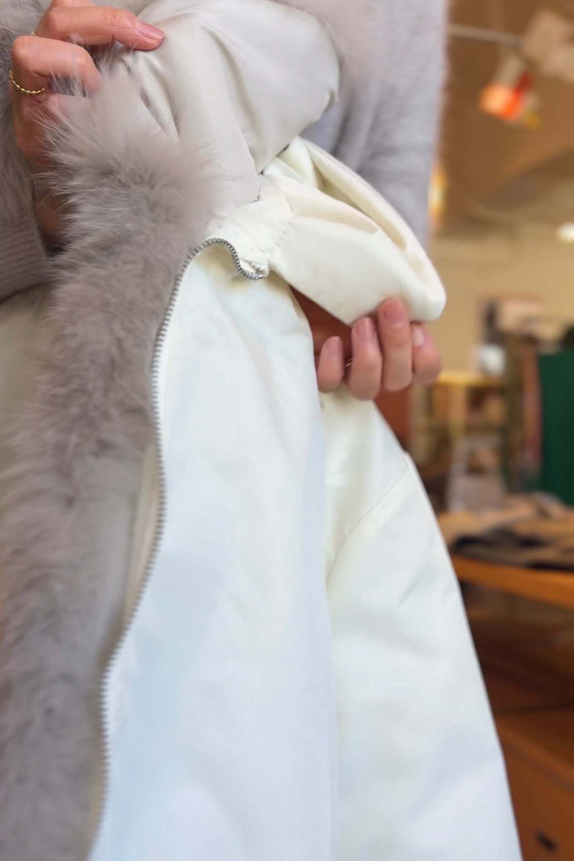 シルバーカラーのFOXファー襟は、前のジップまでライナーとしてチラ見せ。