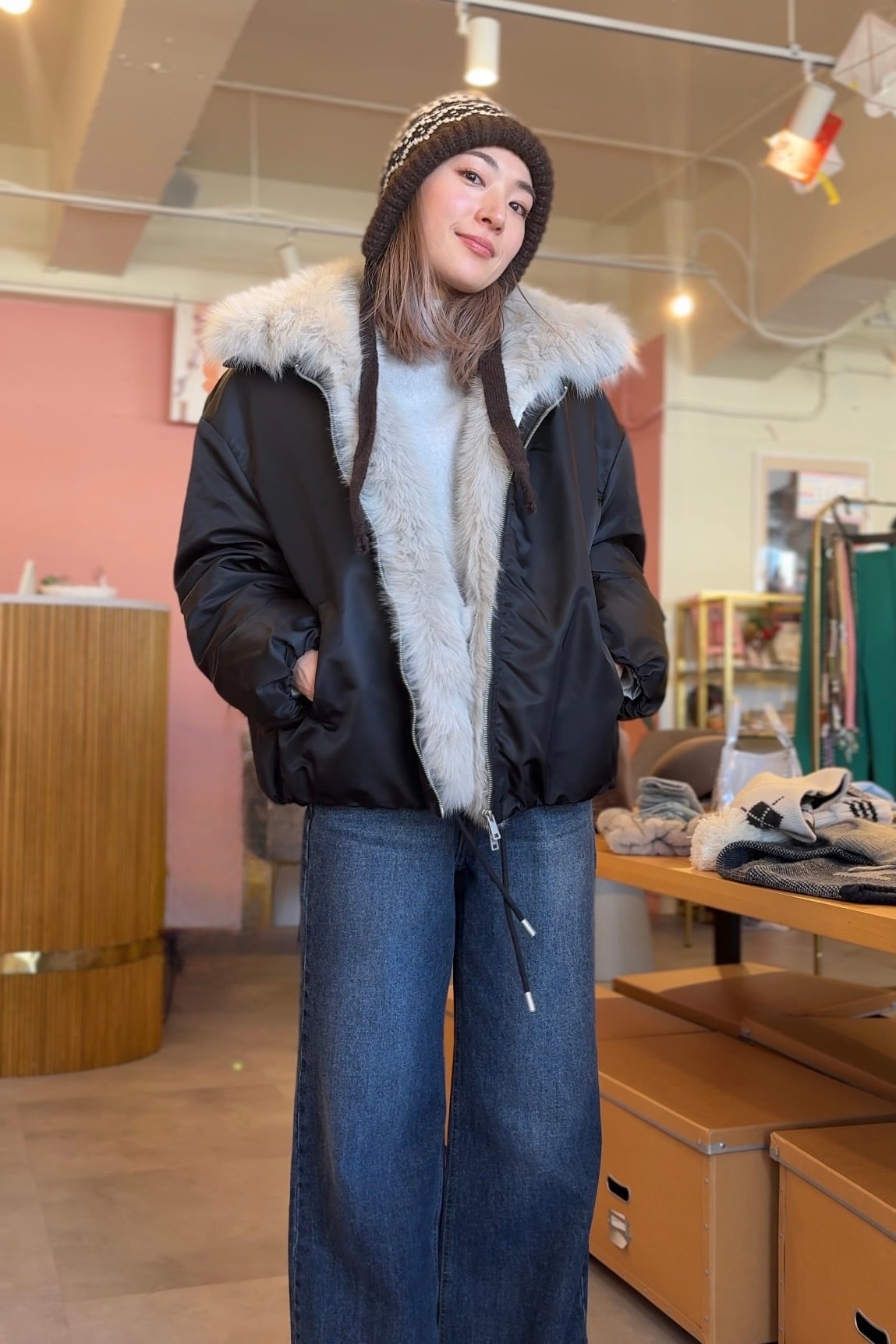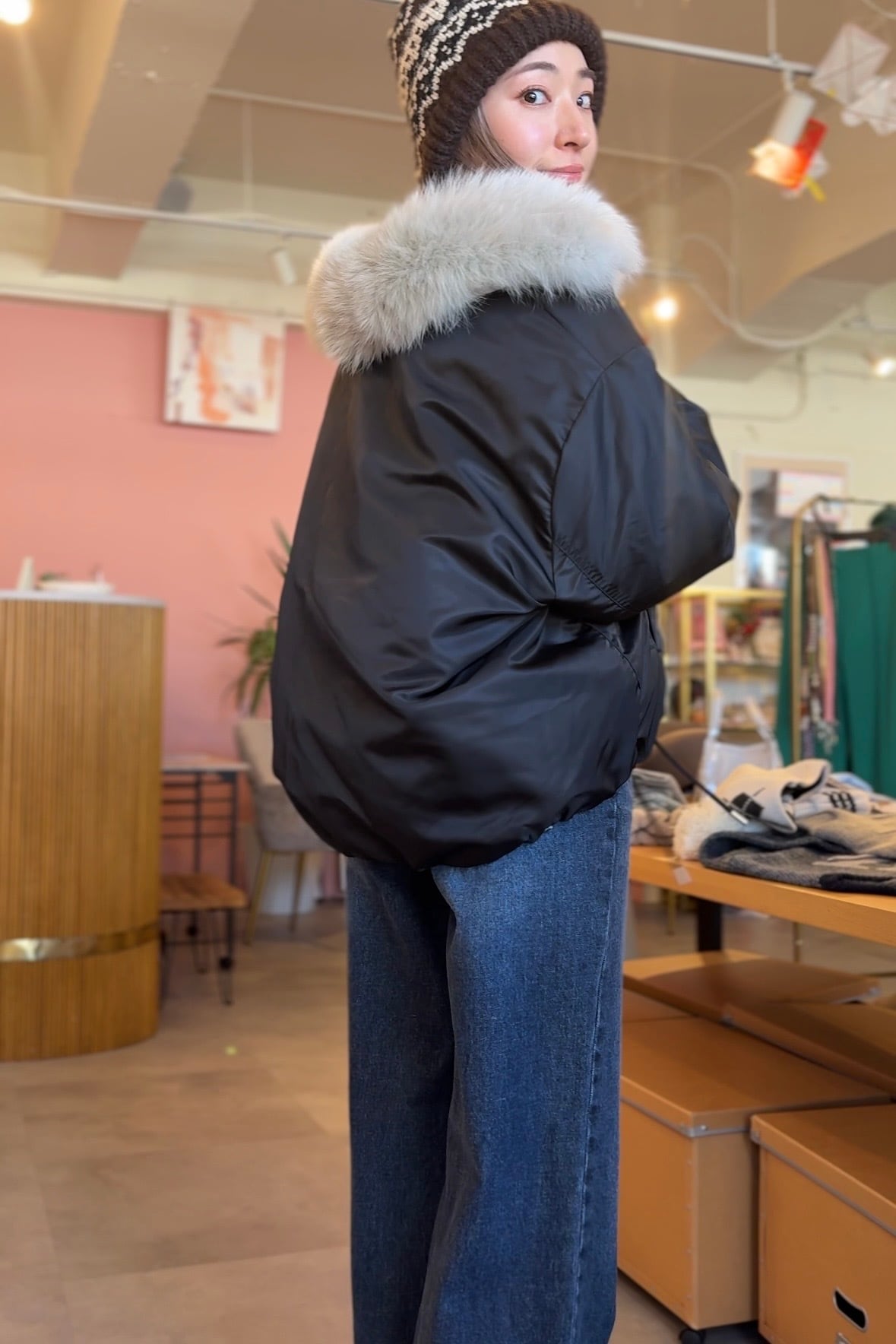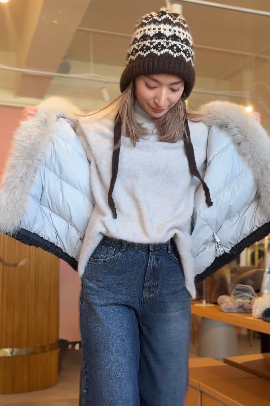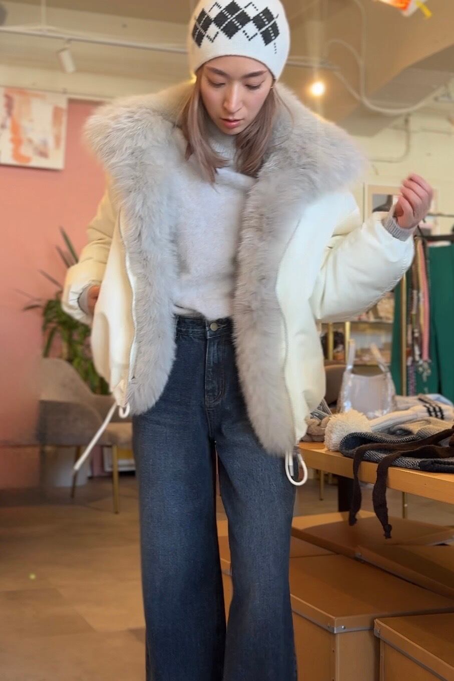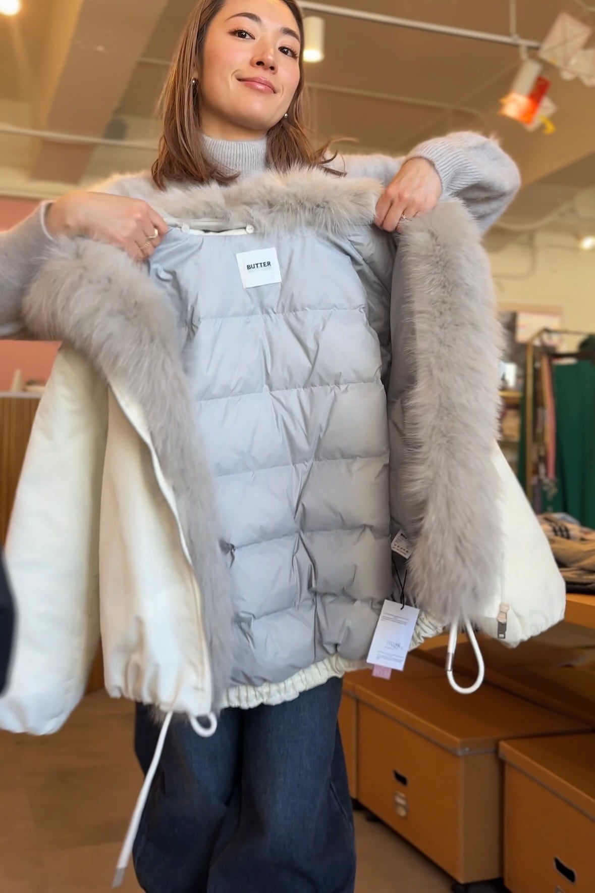 シルバーカラーのFOXファー襟は、前のジップまでライナーとしてチラ見せ。