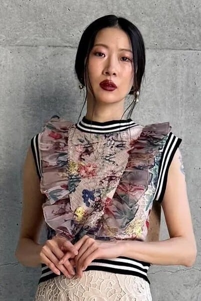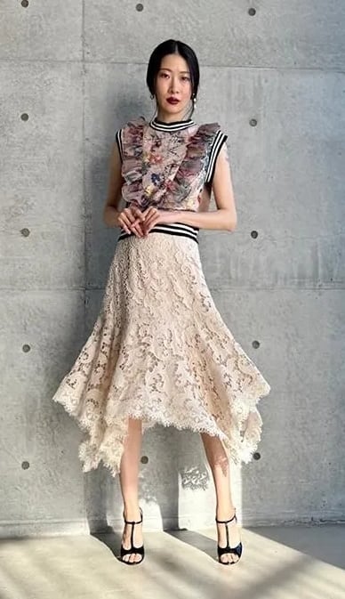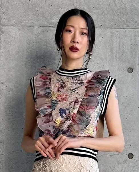 繊細なフラワープリントを重ねたレースとシフォンのフリルが華やかなニットトップです。