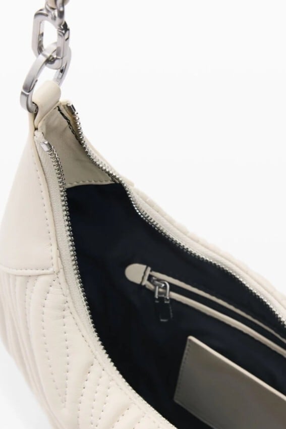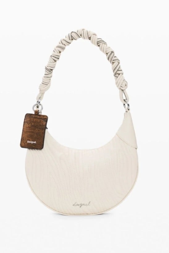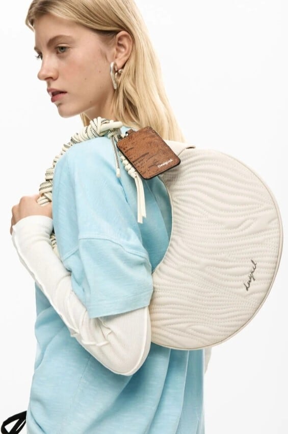 交換可能なストラップが付いた楕円形のミディアムバッグ。短いストラップと、ショルダーバッグスタイルのより長いストラップがあり、同系色の刺しゅうステッチ柄とメタルロゴのアップリケが施されています。