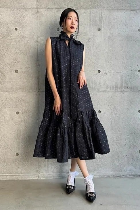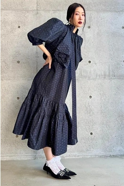 小さなドット柄が可憐なジャガード素材で仕立てたAラインシルエットのワンピースです。
