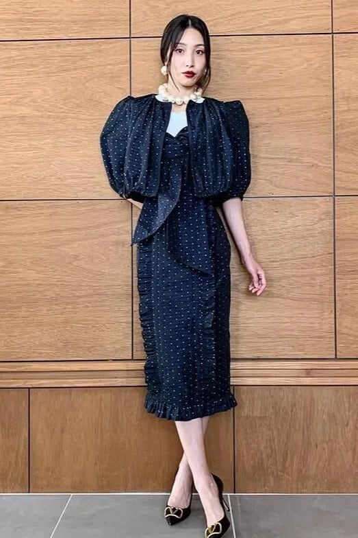 小さなドット柄のジャガード生地に、バルーンシルエットが大人可愛いジャケット。