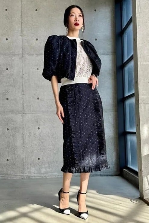 落ちついた雰囲気のドット柄と立体的で表情感のあるジャガード生地が特徴的。コンパクトな丈感で、ロング丈のボトムとも相性◎