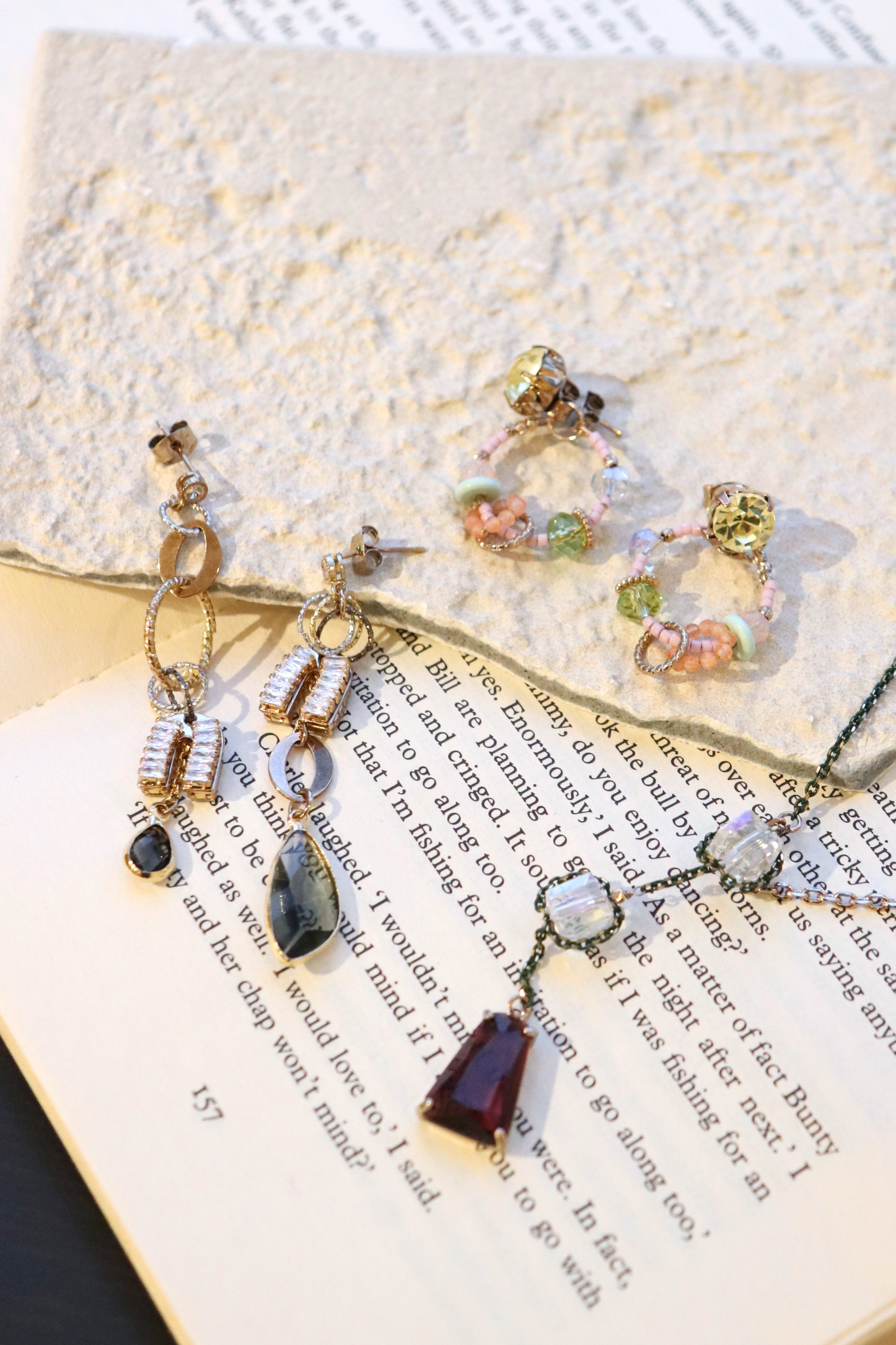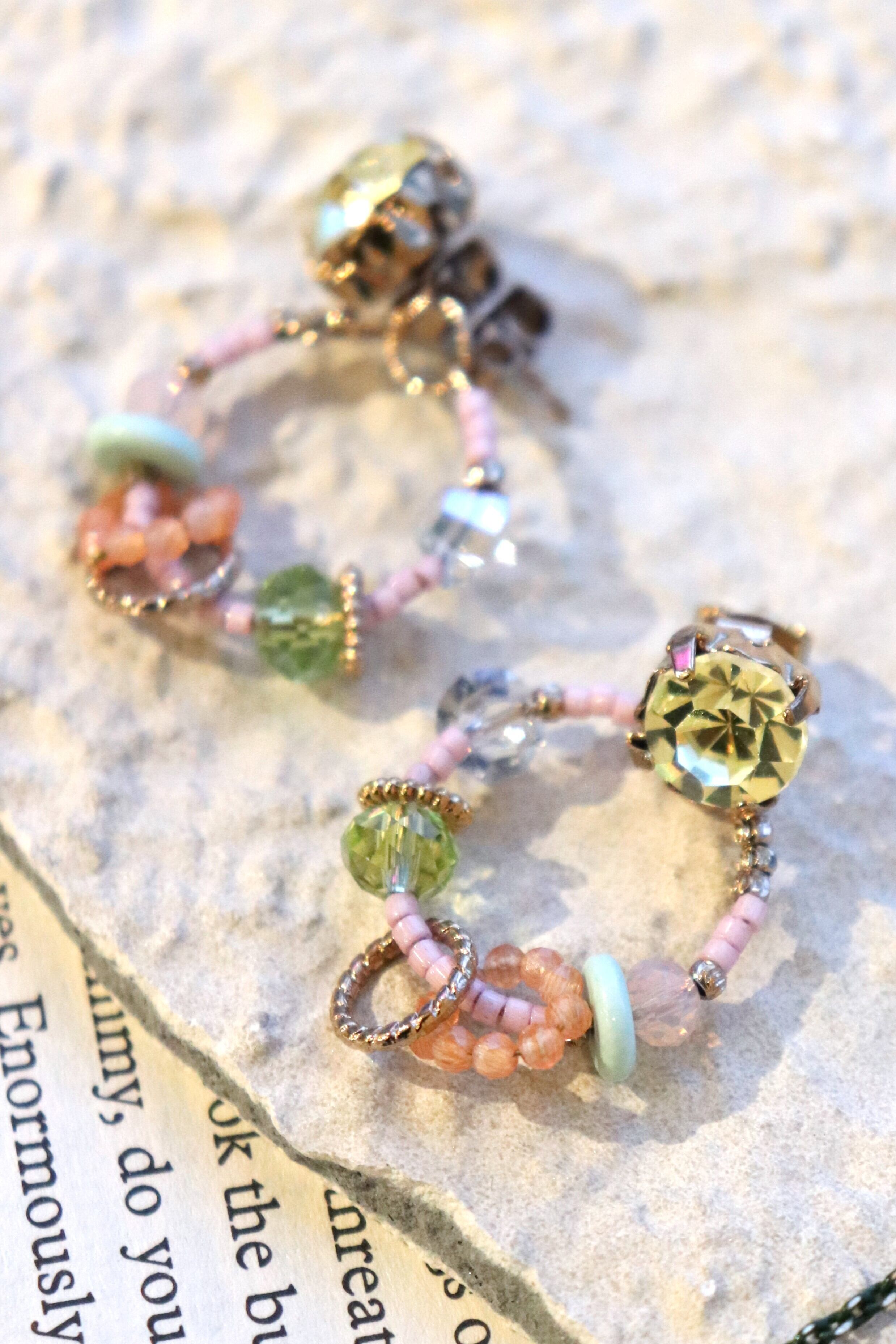 細かなビーズのモチーフとビジューが煌めくフープピアス。
