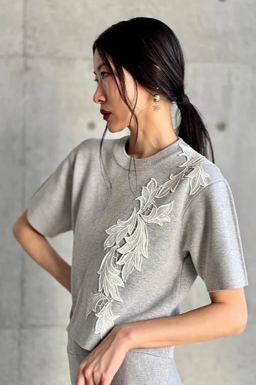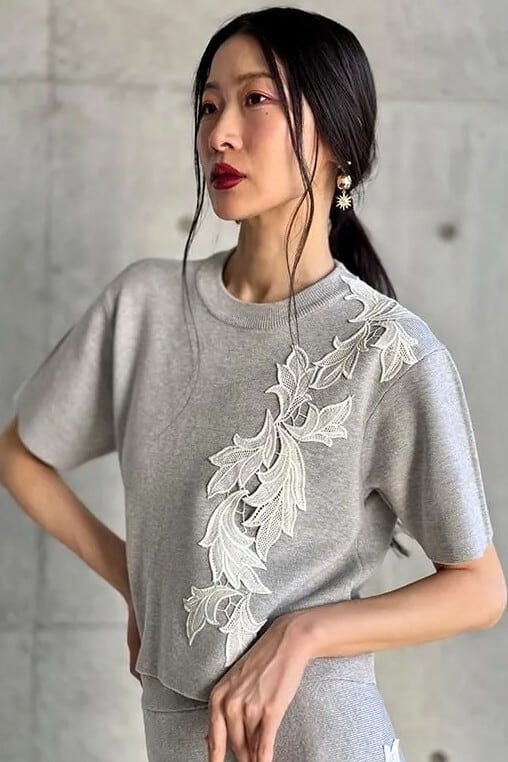 印象的なレースモチーフに、ミラノリブでハリのあるフォルムが特徴のニットtopでしす。
