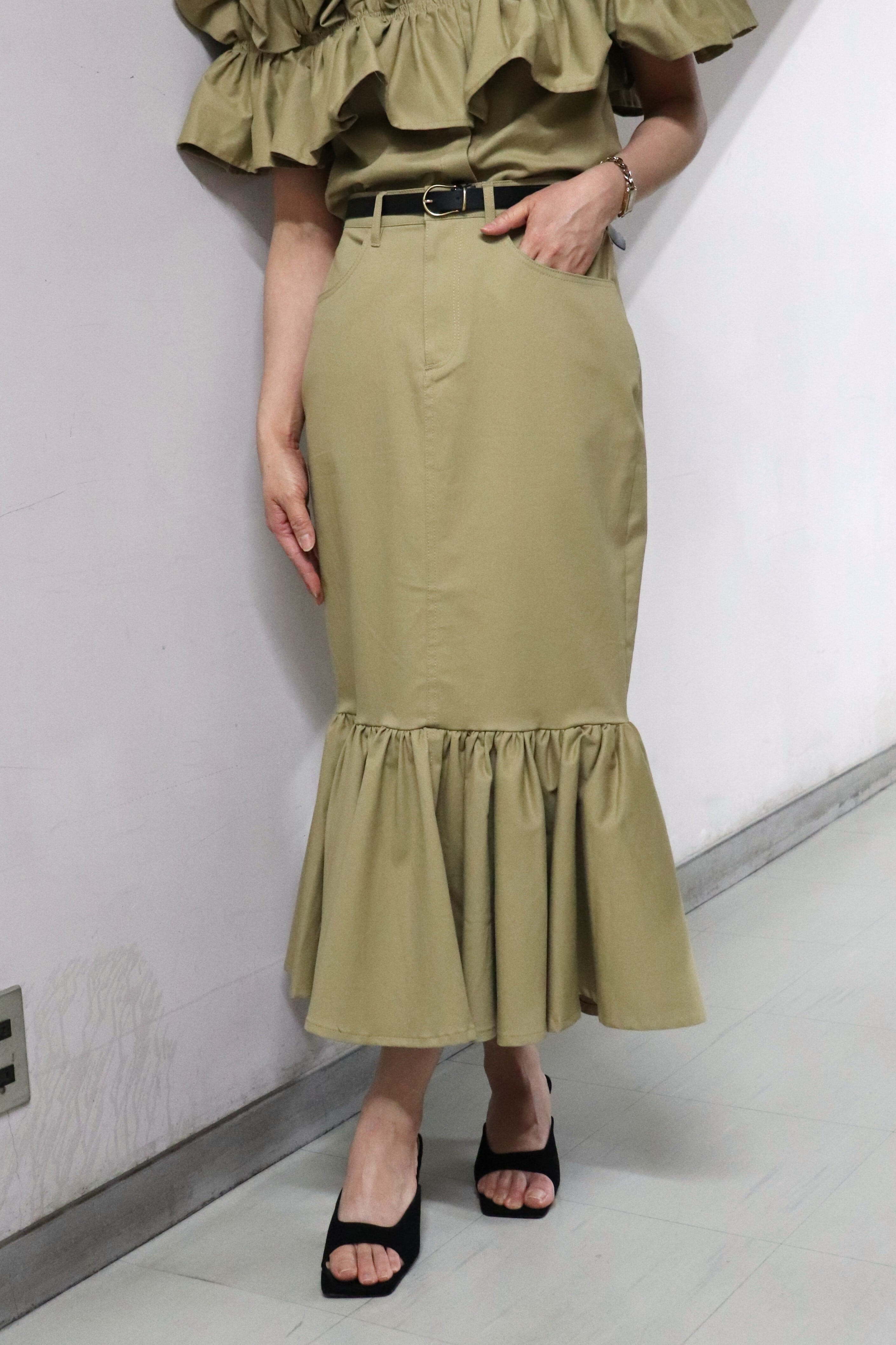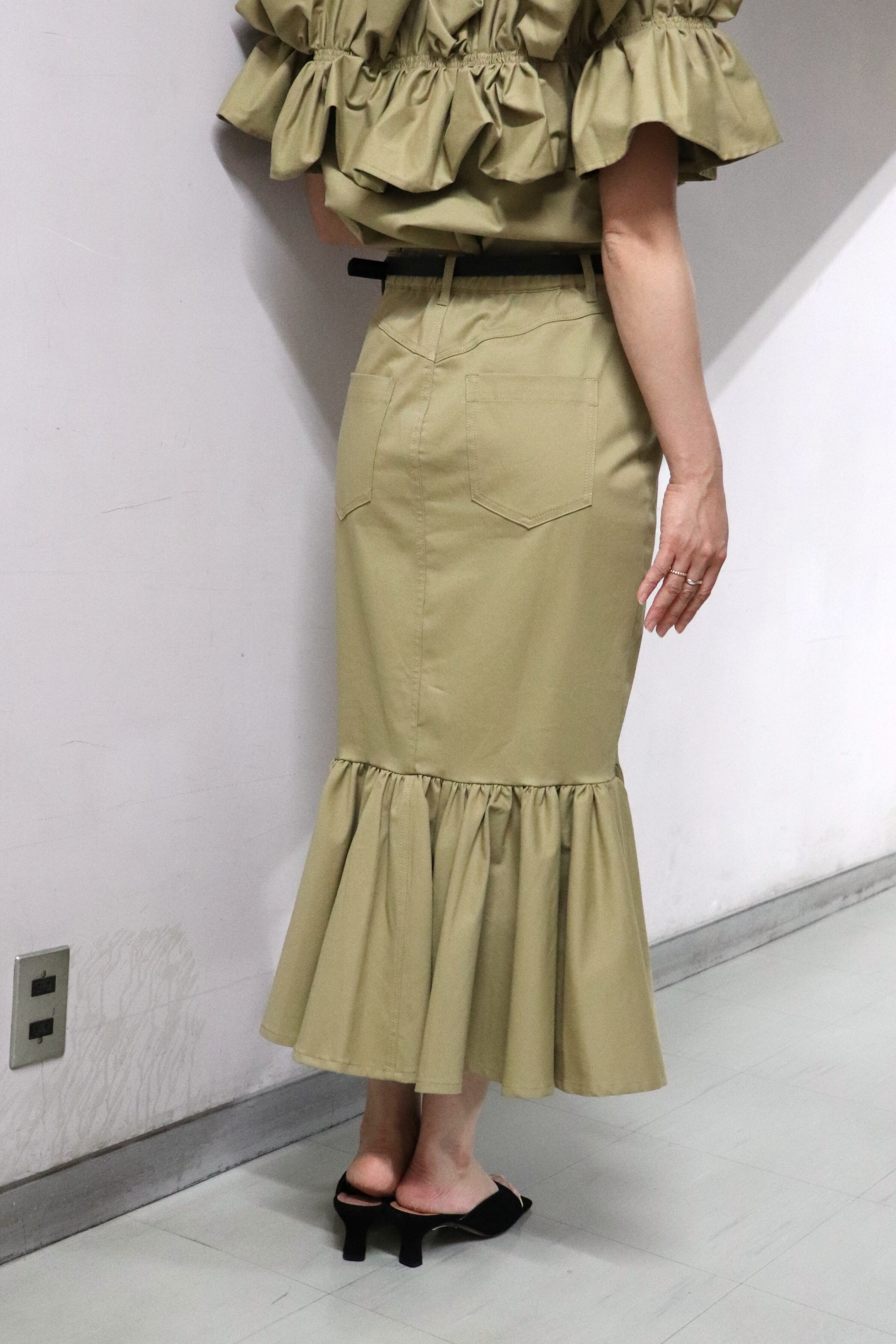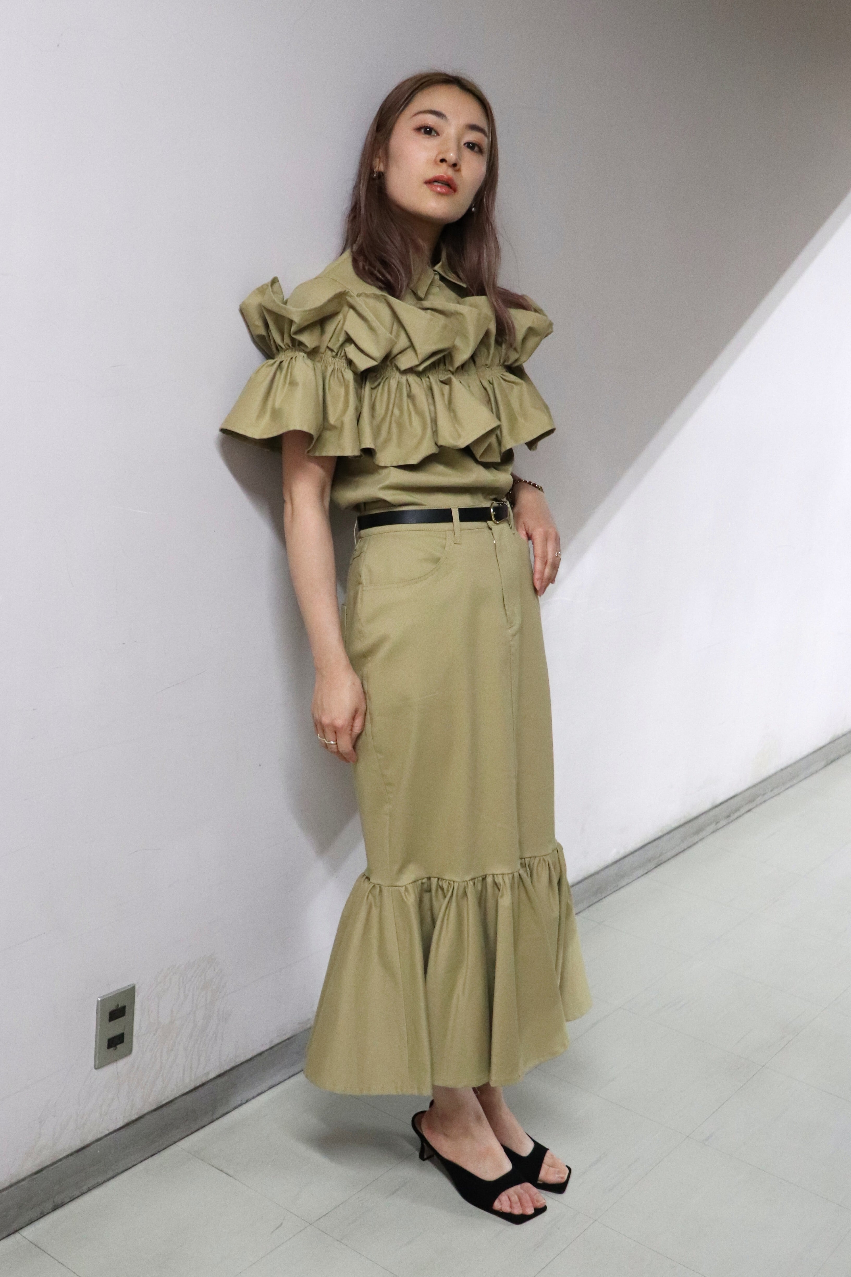 上質なインド綿を少し起毛させたなめらかな手触りのチノを、フリルたっぷりのマーメイドスカートに仕立てました。