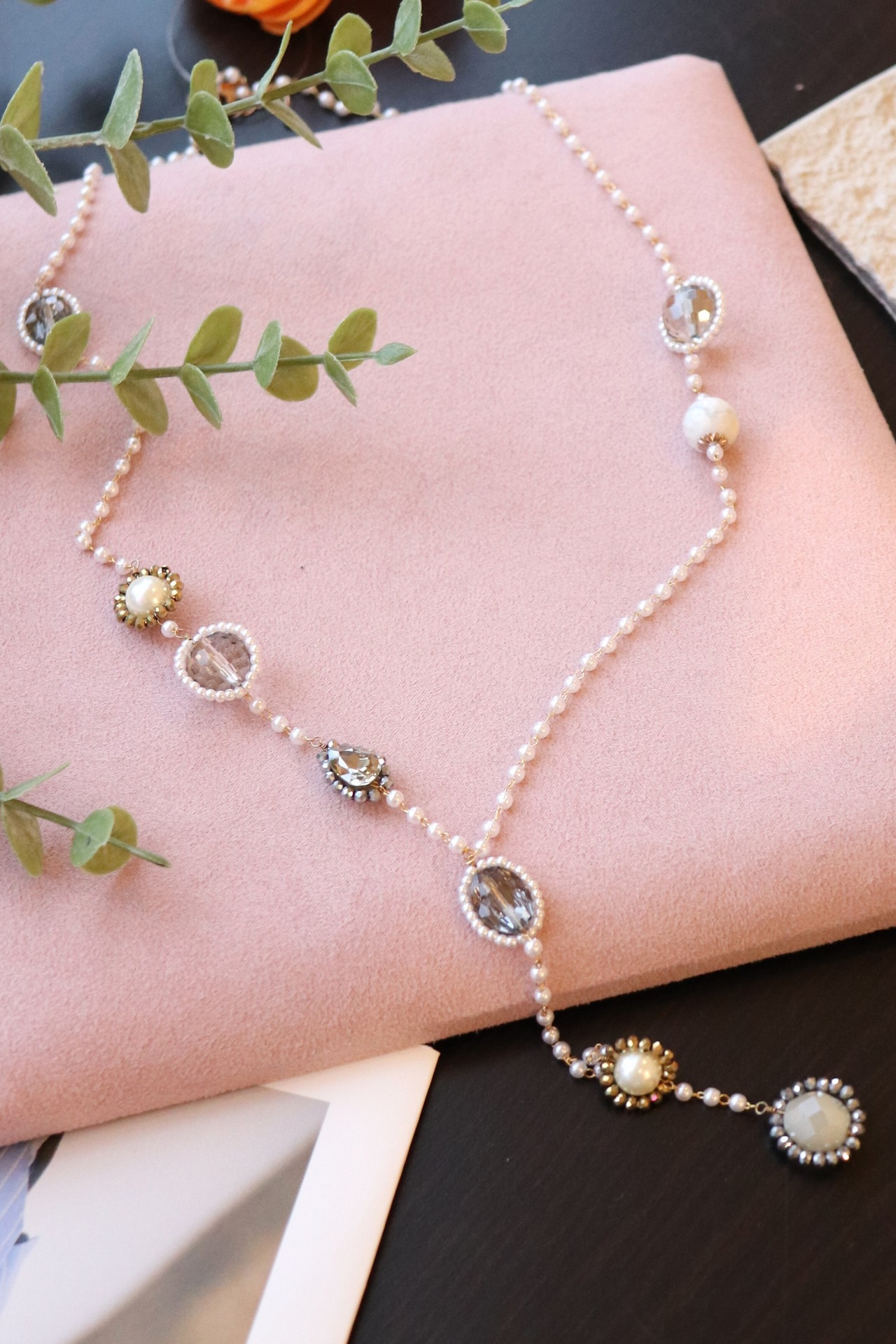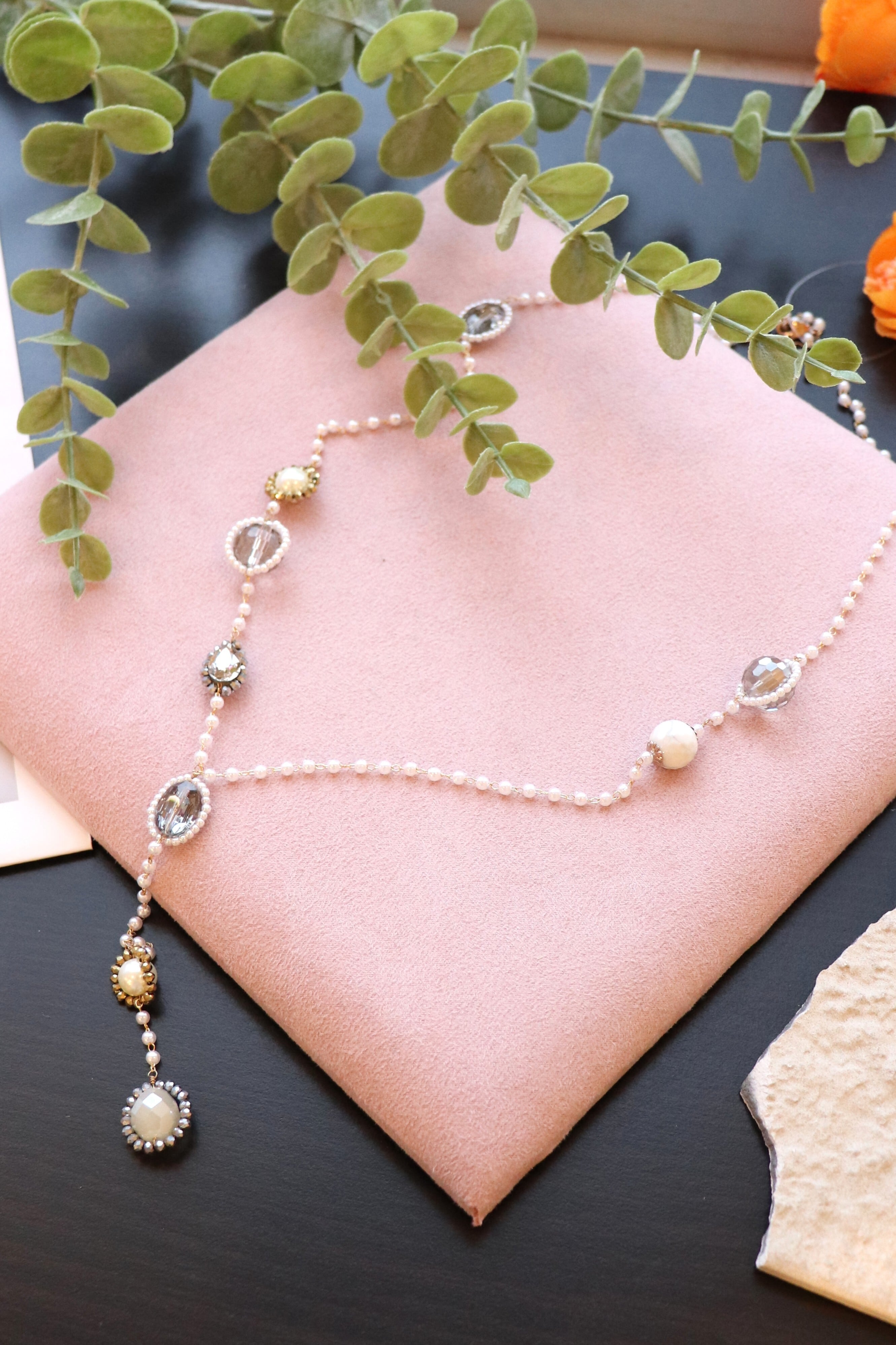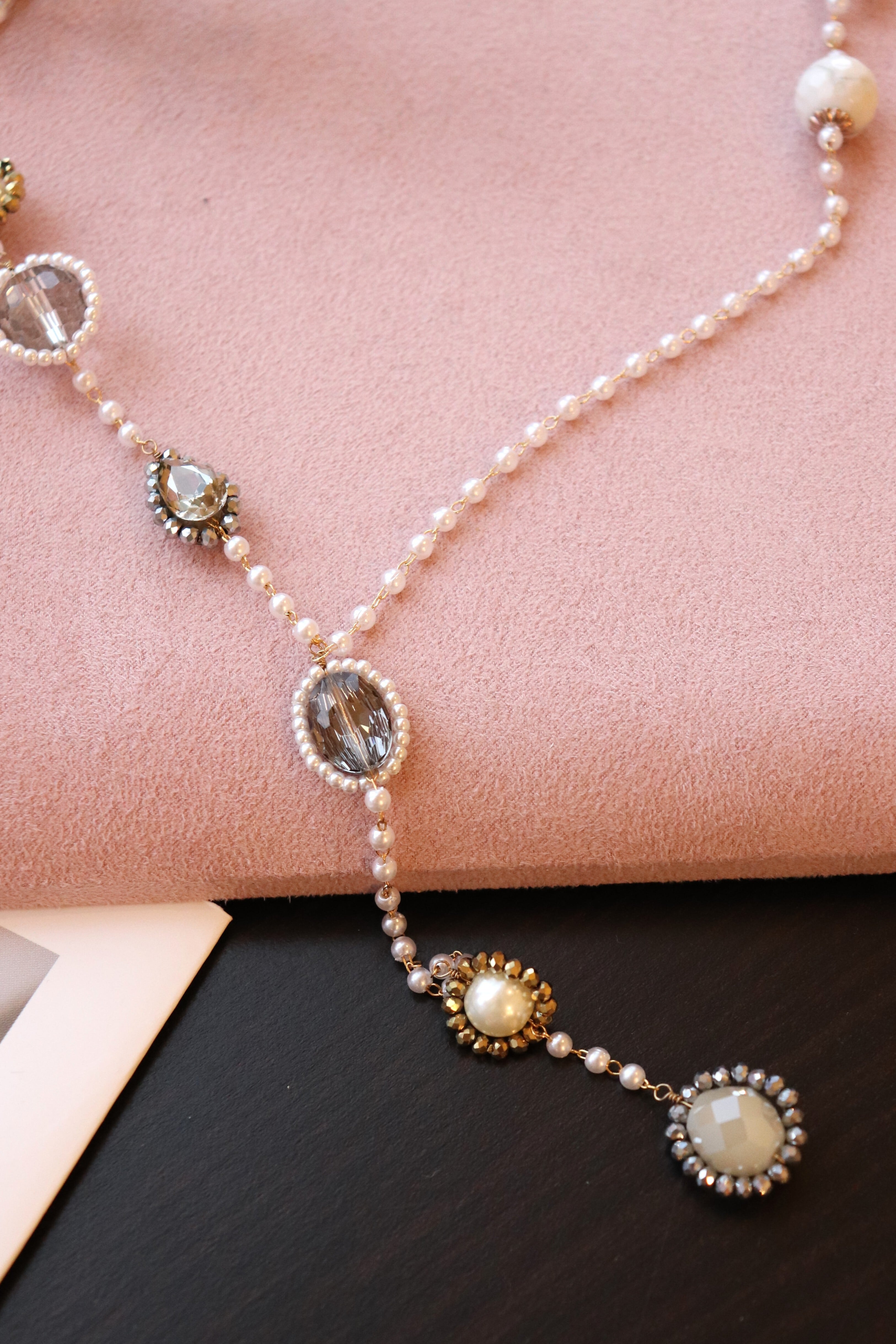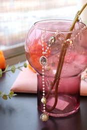 小粒パールと煌めくビジューが上品なロングネックレス。