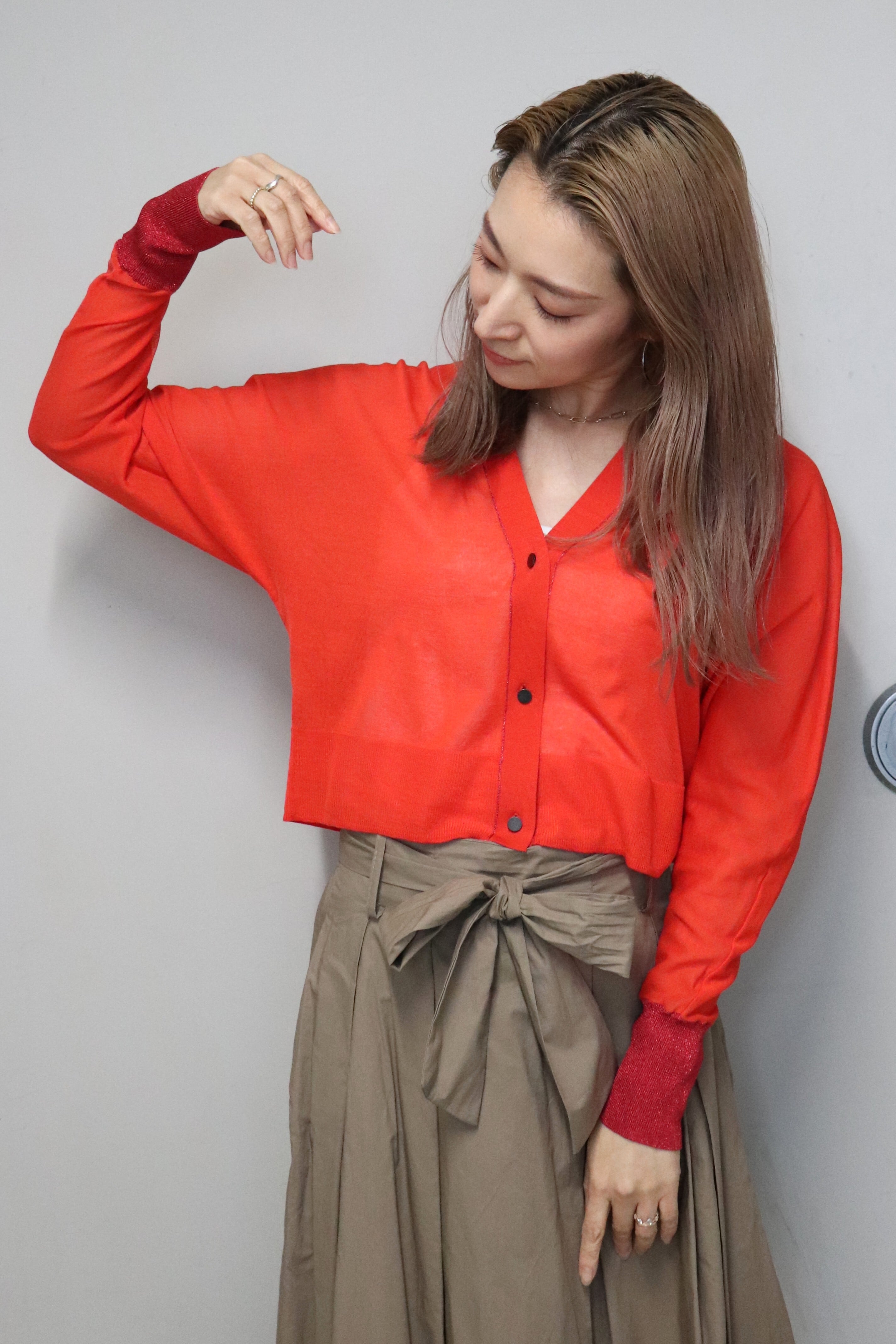 袖のラメが煌めいて女性らしさを演出してくれるカーディガン。