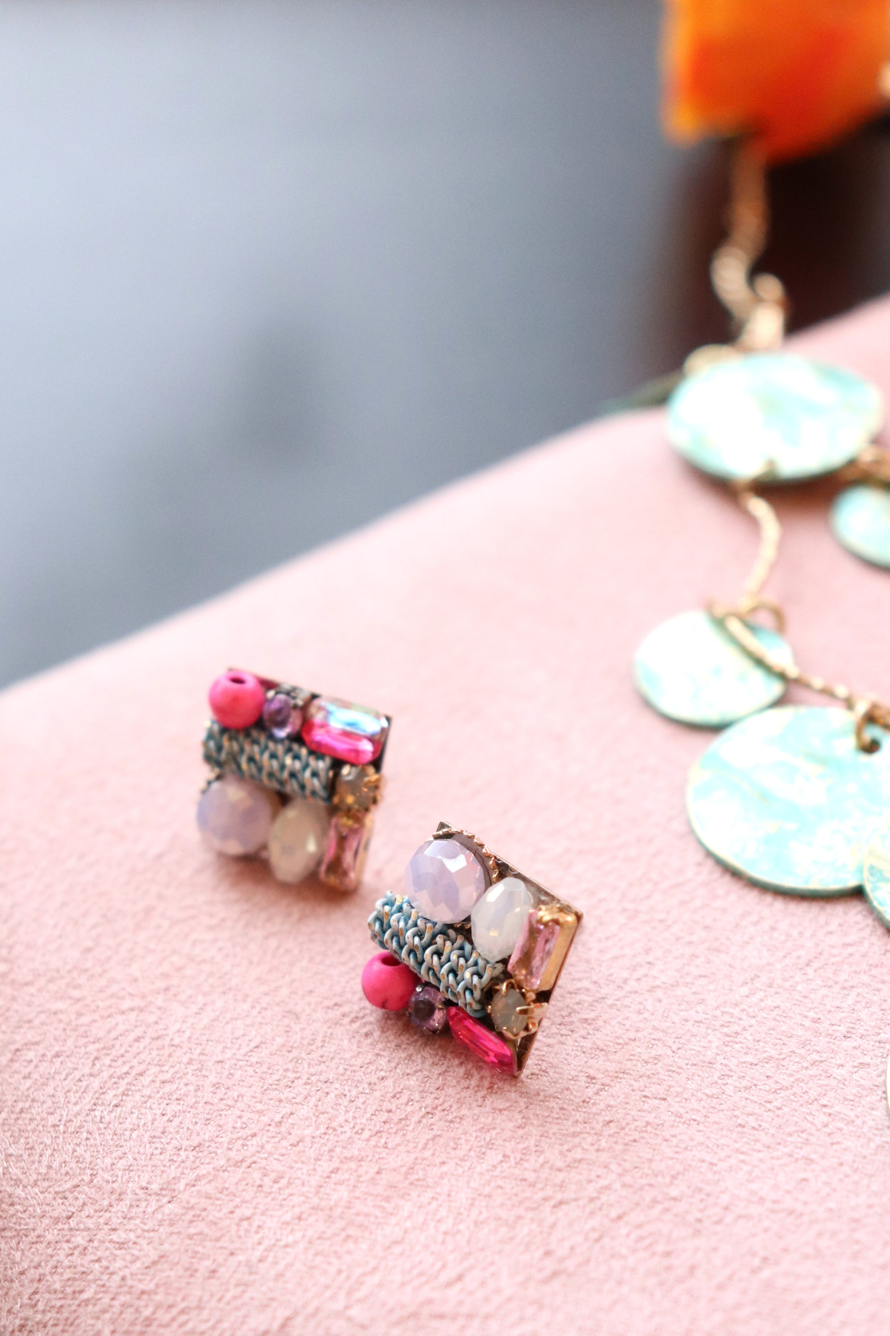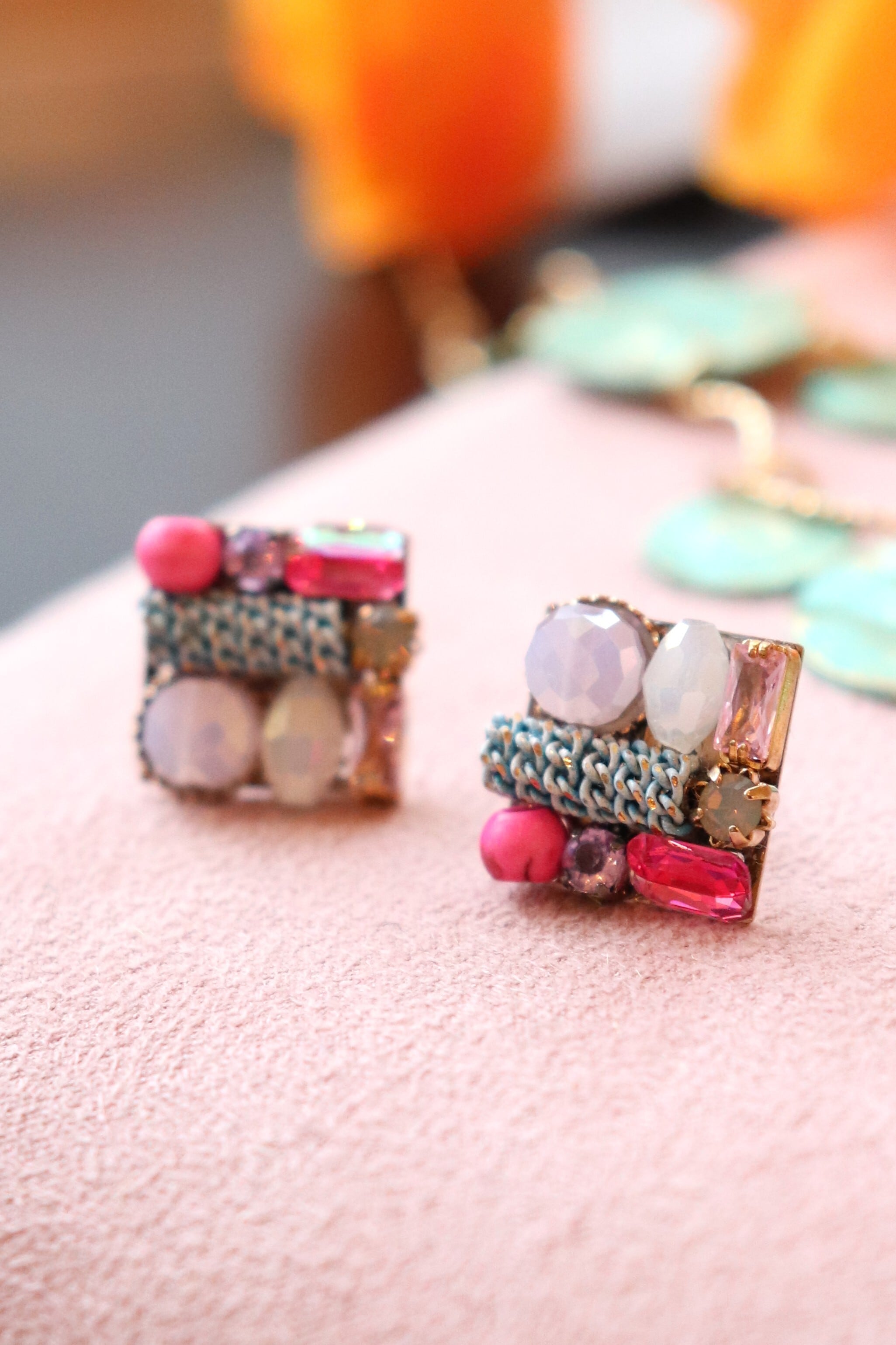 小粒のビジューやチェーンが煌めくスクエアピアス。