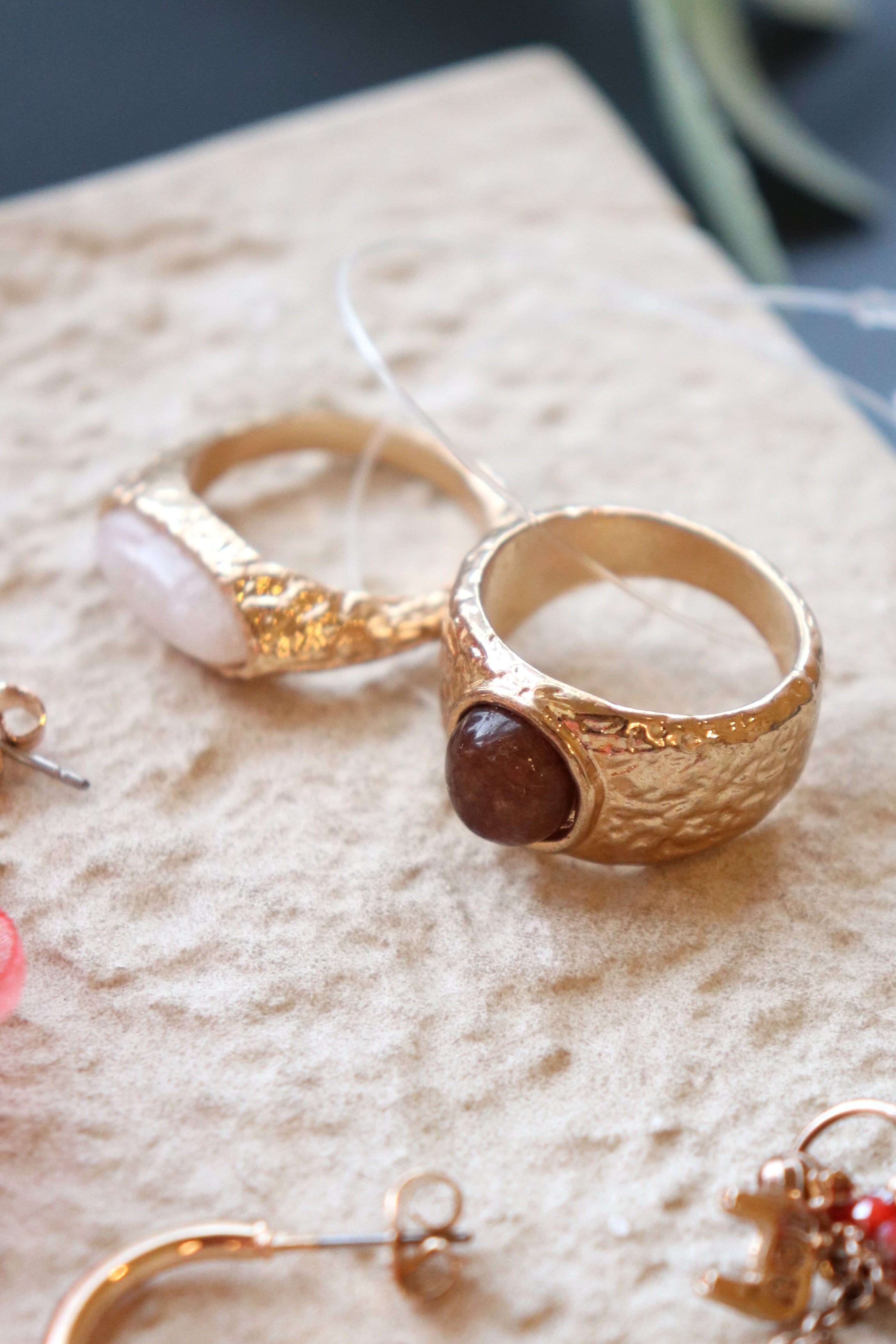ブラウンの大き目ストーンと、凹凸の効いたゴールドが相性抜群!