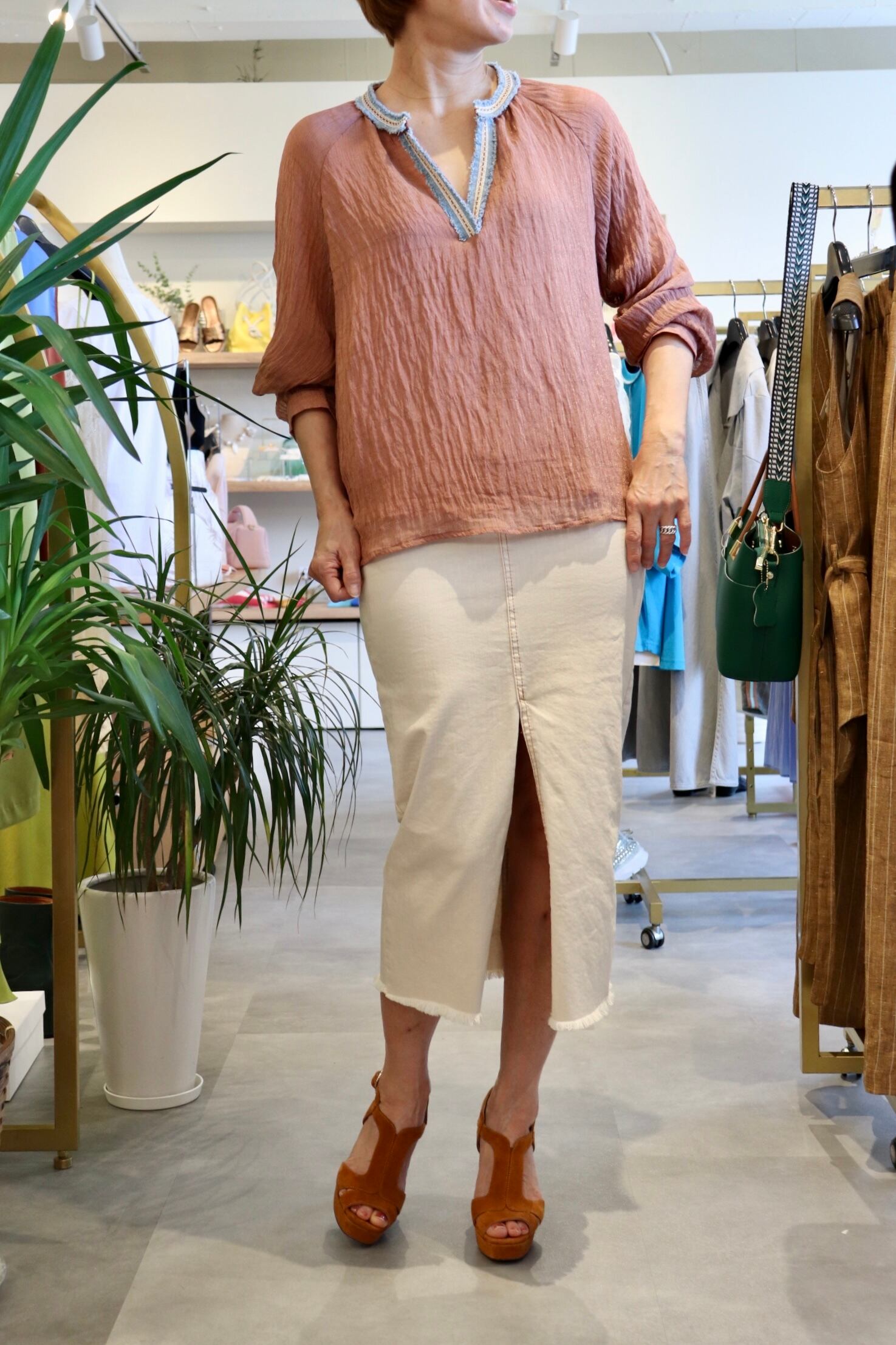 ラメがさりげなく光るしわ加工シフォン素材に、スキッパーネックのデニムフリンジがポイントのインポートブラウス。