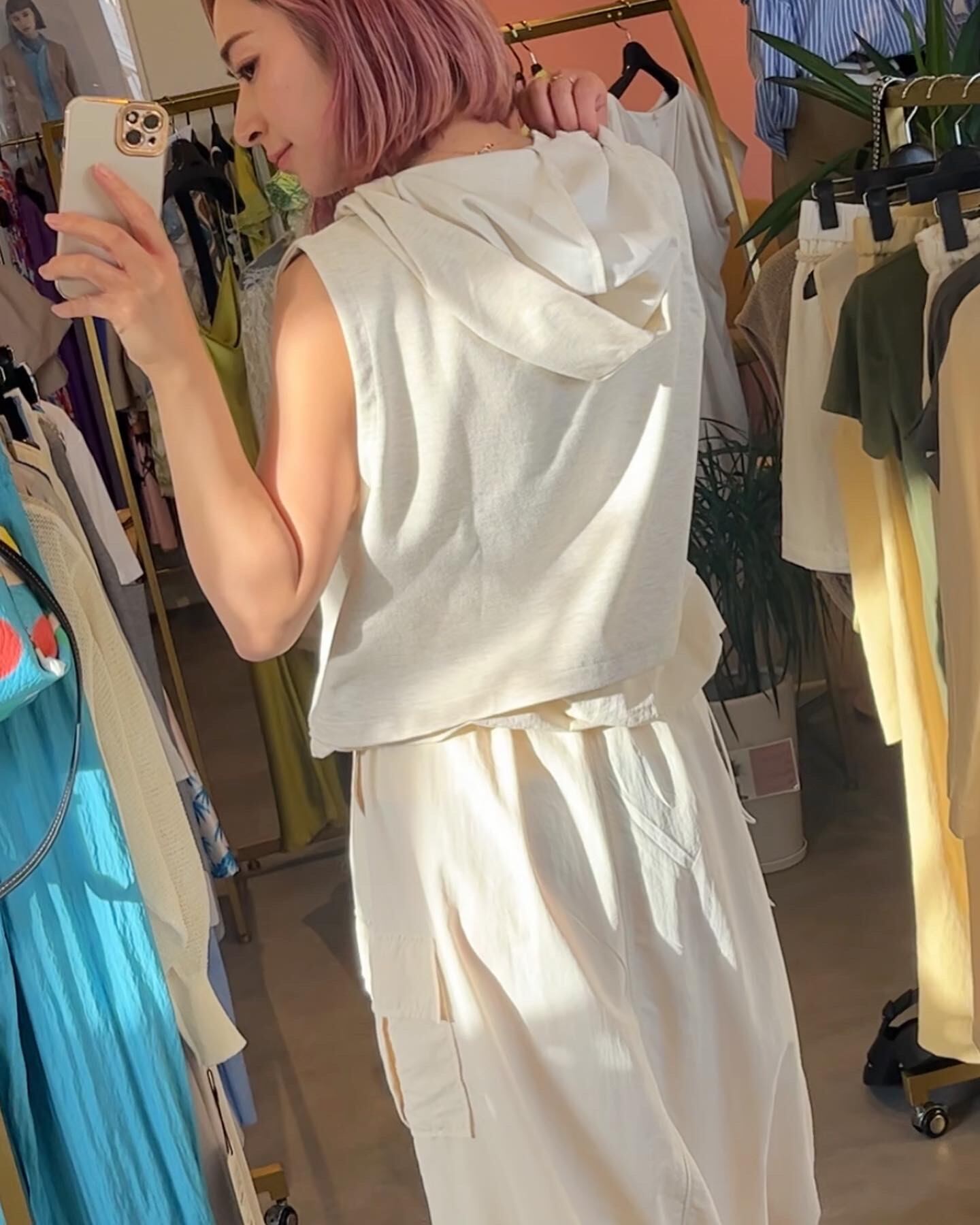 「Nylon drawstring cargo skirt」とのセットアップ着用がおすすめです。