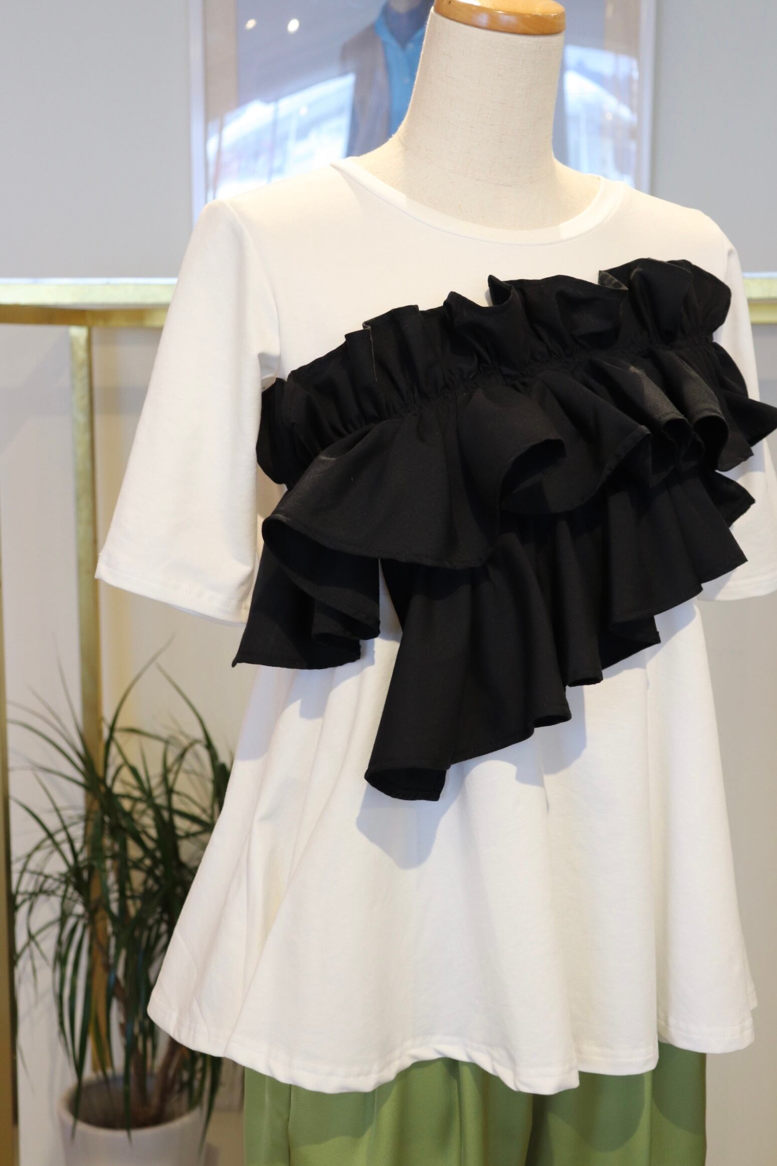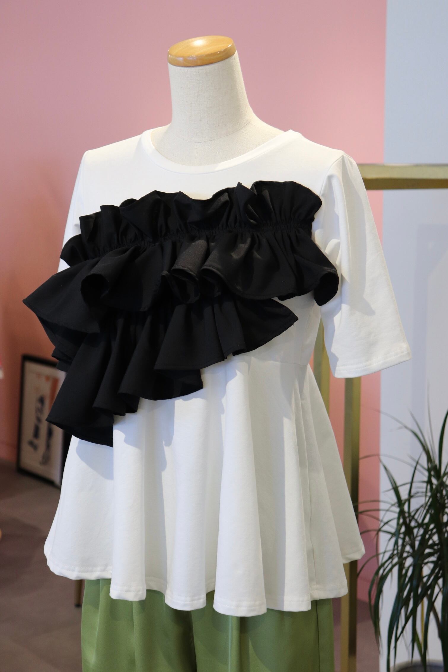 ブラックのフリルがお洒落なだけでなく、ウエストの切替でスタイルアップ効果も抜群です◎